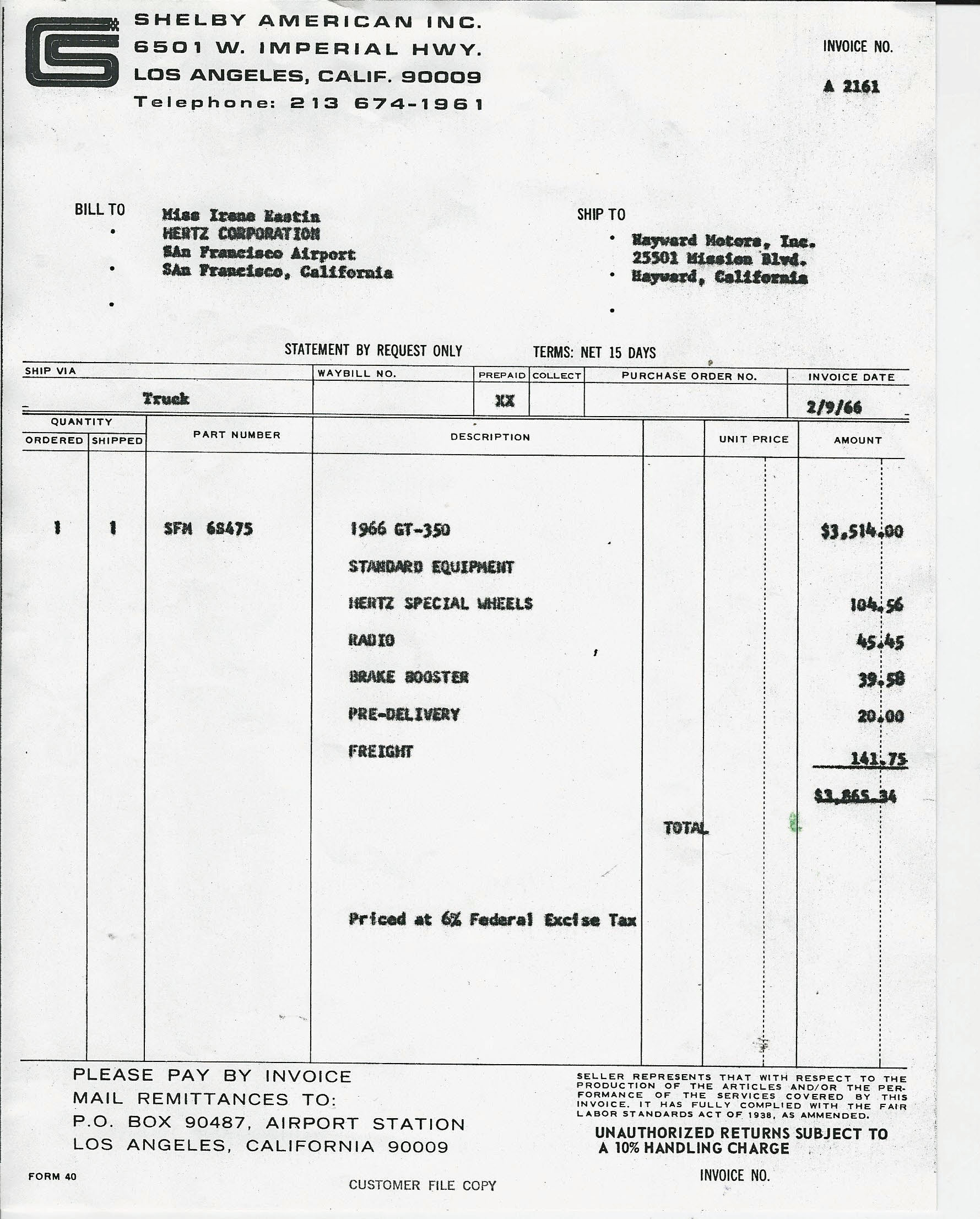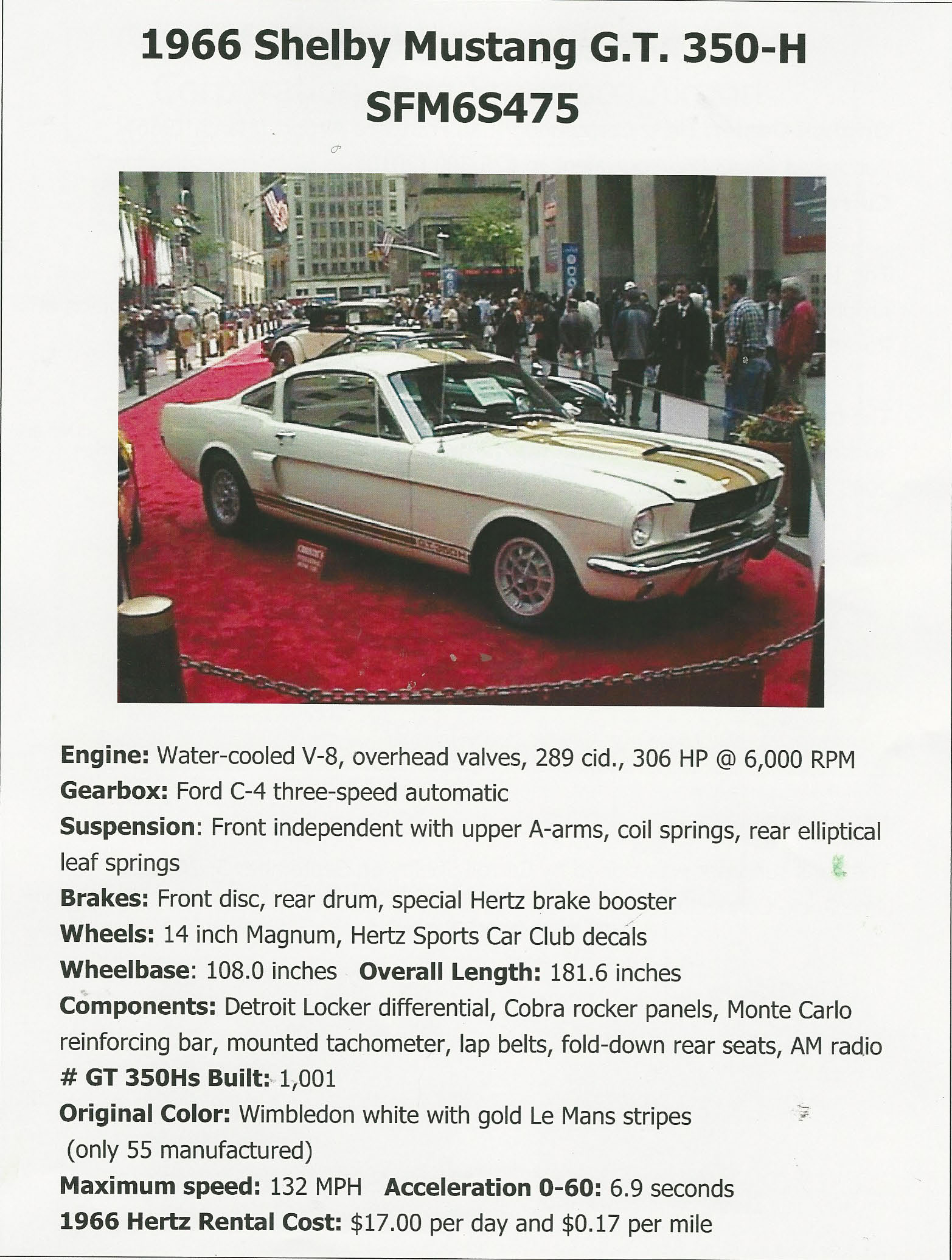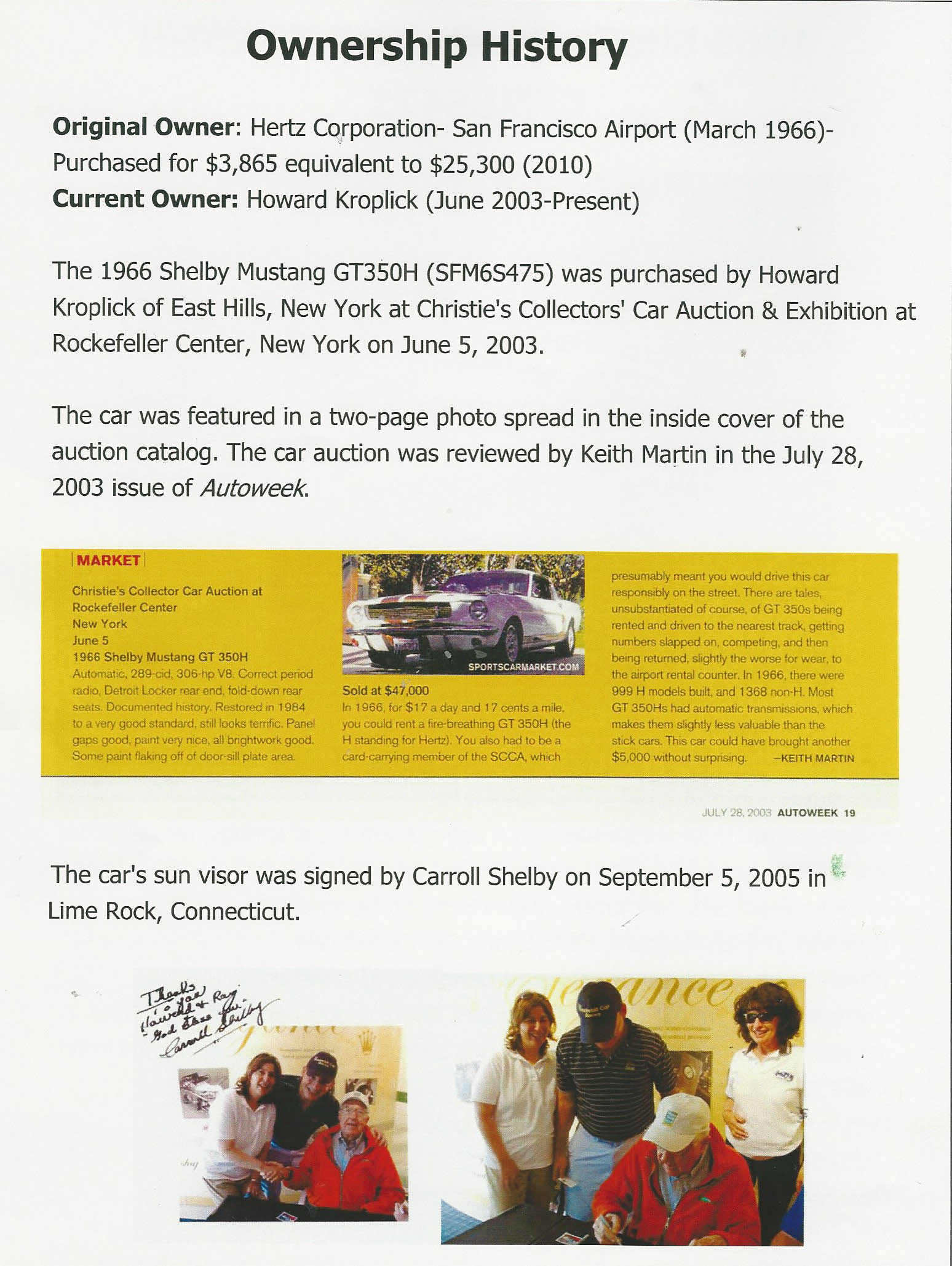 The 1966 Shelby Mustang GT350-H SFM6S475 was purchased by Howard Kroplick at Christie's Collectors' Car Auction & Exhibition at Rockefeller Center, New York on June 5, 2003.