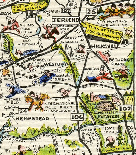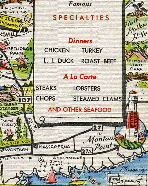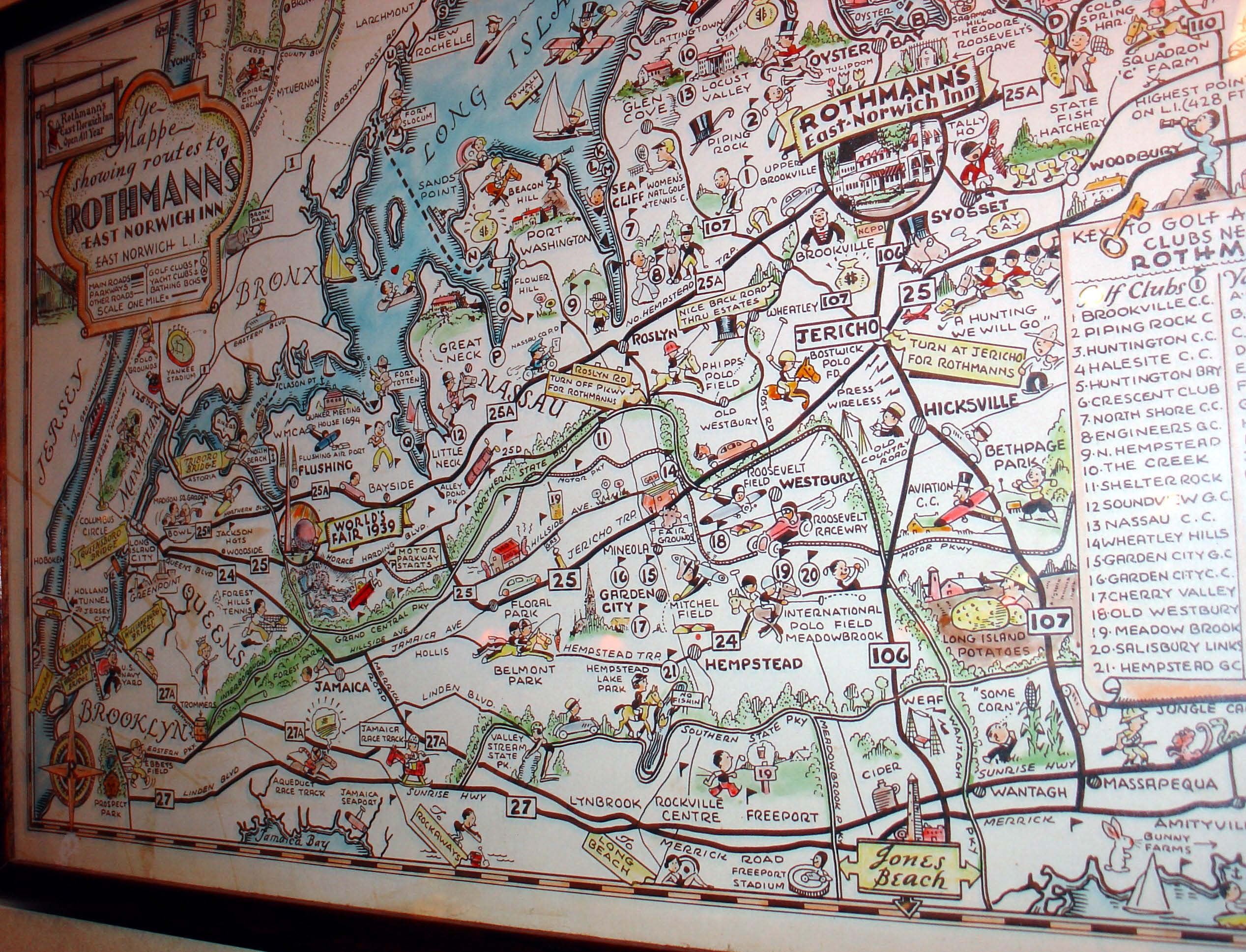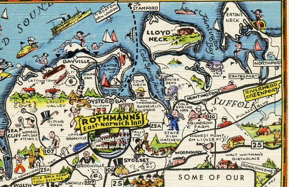 Rothmann's Restaurant in East Norwich has been a fixture on Long Island since 1907. Rothmann's issued this cartoon postcard in 1937 showing the routes to their restaurant including the Long Island Motor Parkway. Postcard courtesy of Gary Hammond.