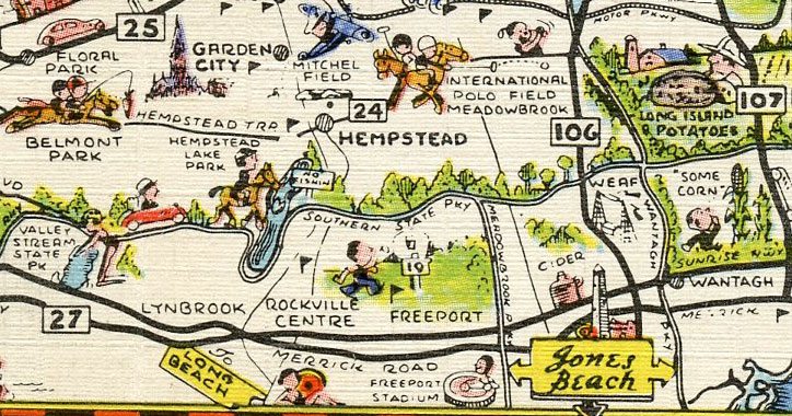 "Ye Mappe" designated main roads, parkways, other roads, golf clubs, yacht clubs and bathing beaches. In 1937, the Long Island Motor Parkway was marked as a "Main Road" rather than a "Parkway".