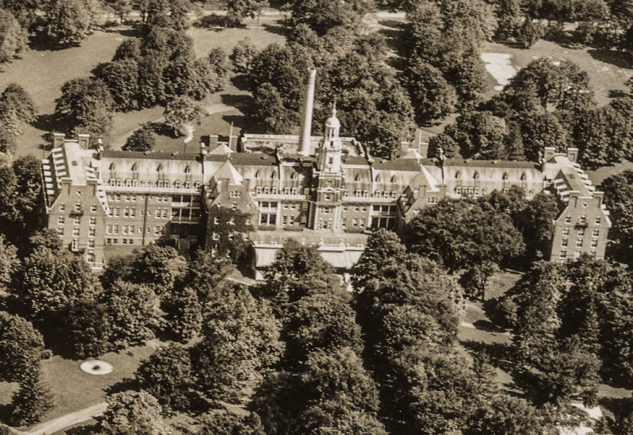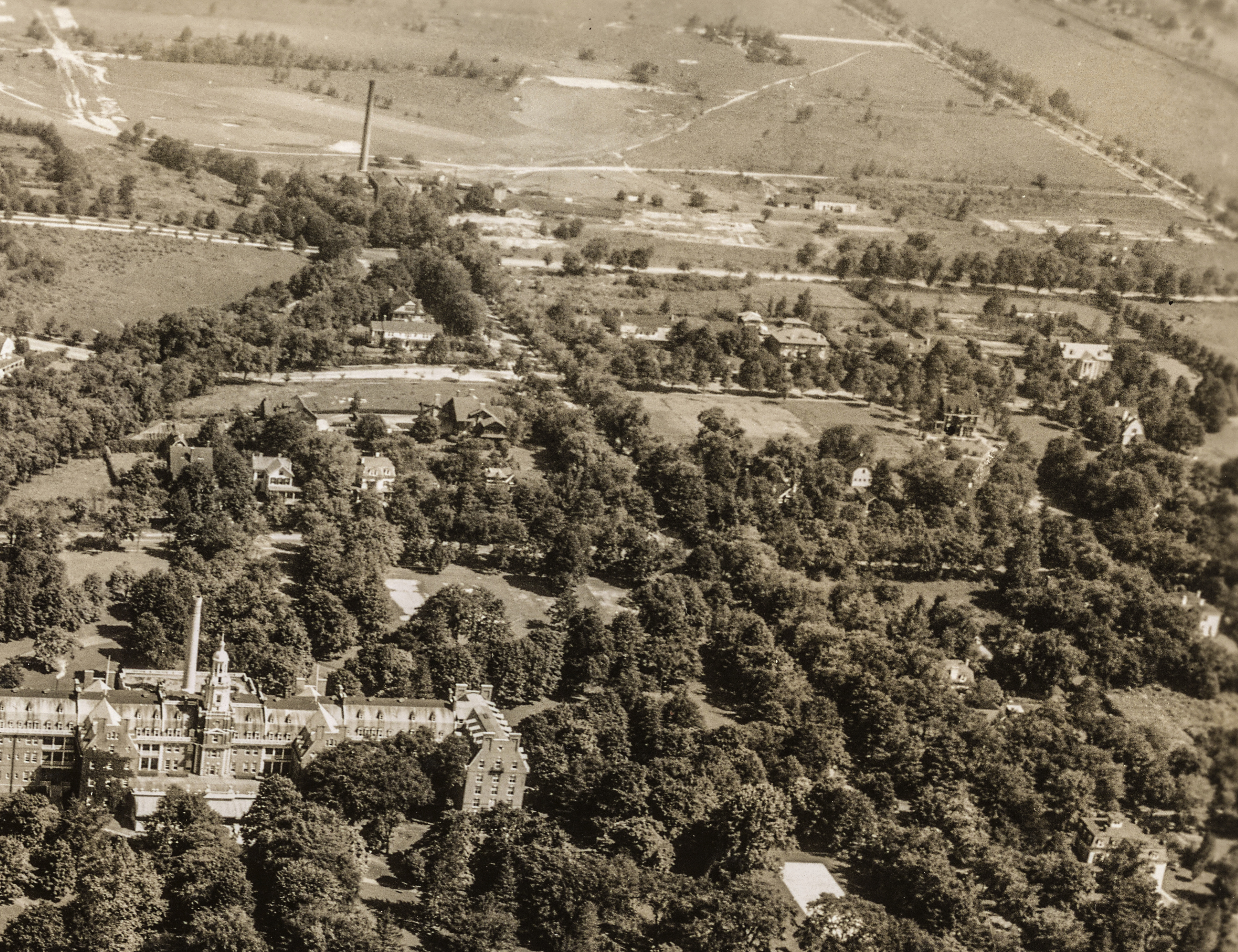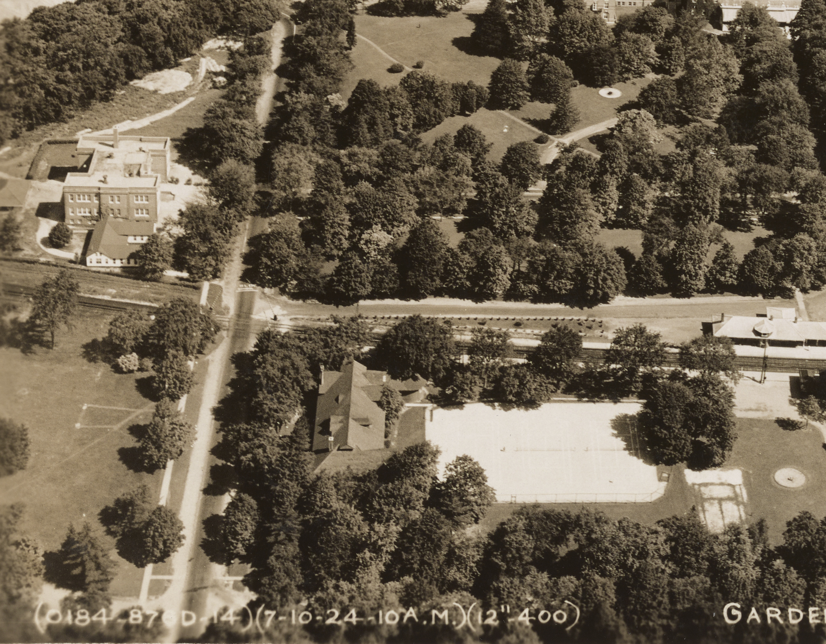 Lower left corner is the Garden City Casino and tennis courts. Top center is the smoke stack for the Garden City Water Works. Left side above the Casino is the school administration building. Bottom center is the LIRR train station.