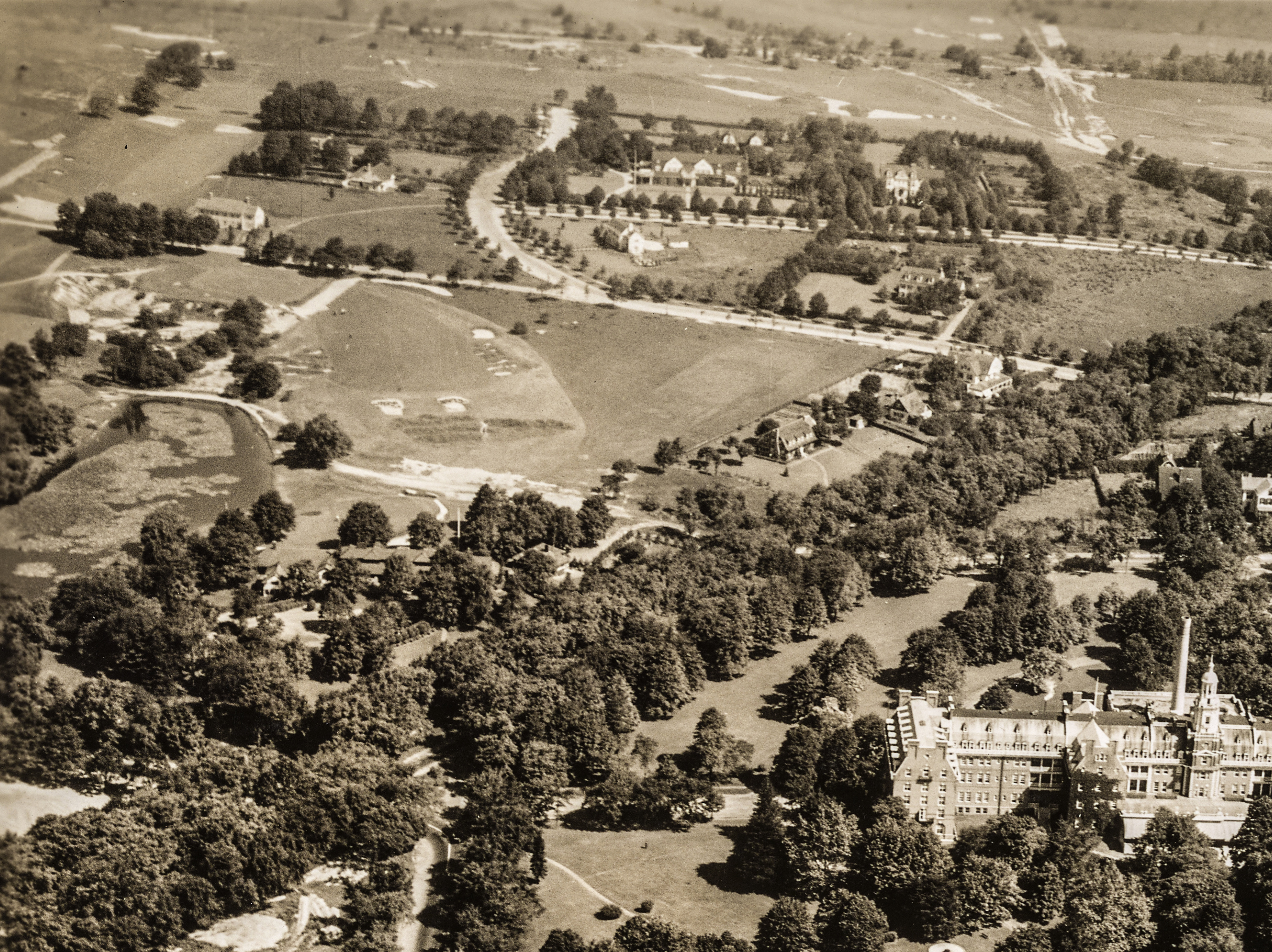 This may be the earliest known aerial of the headquarters for the Vanderbilt Cup Races from 1904 to 1910.