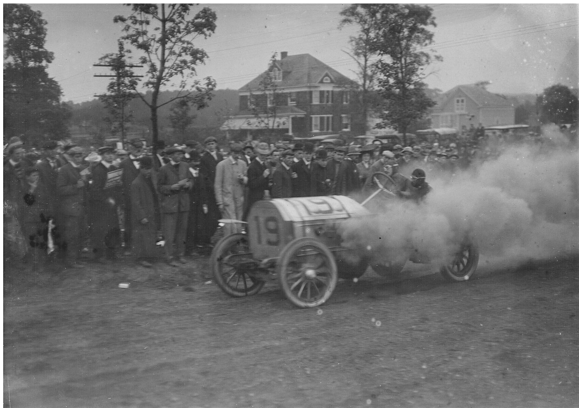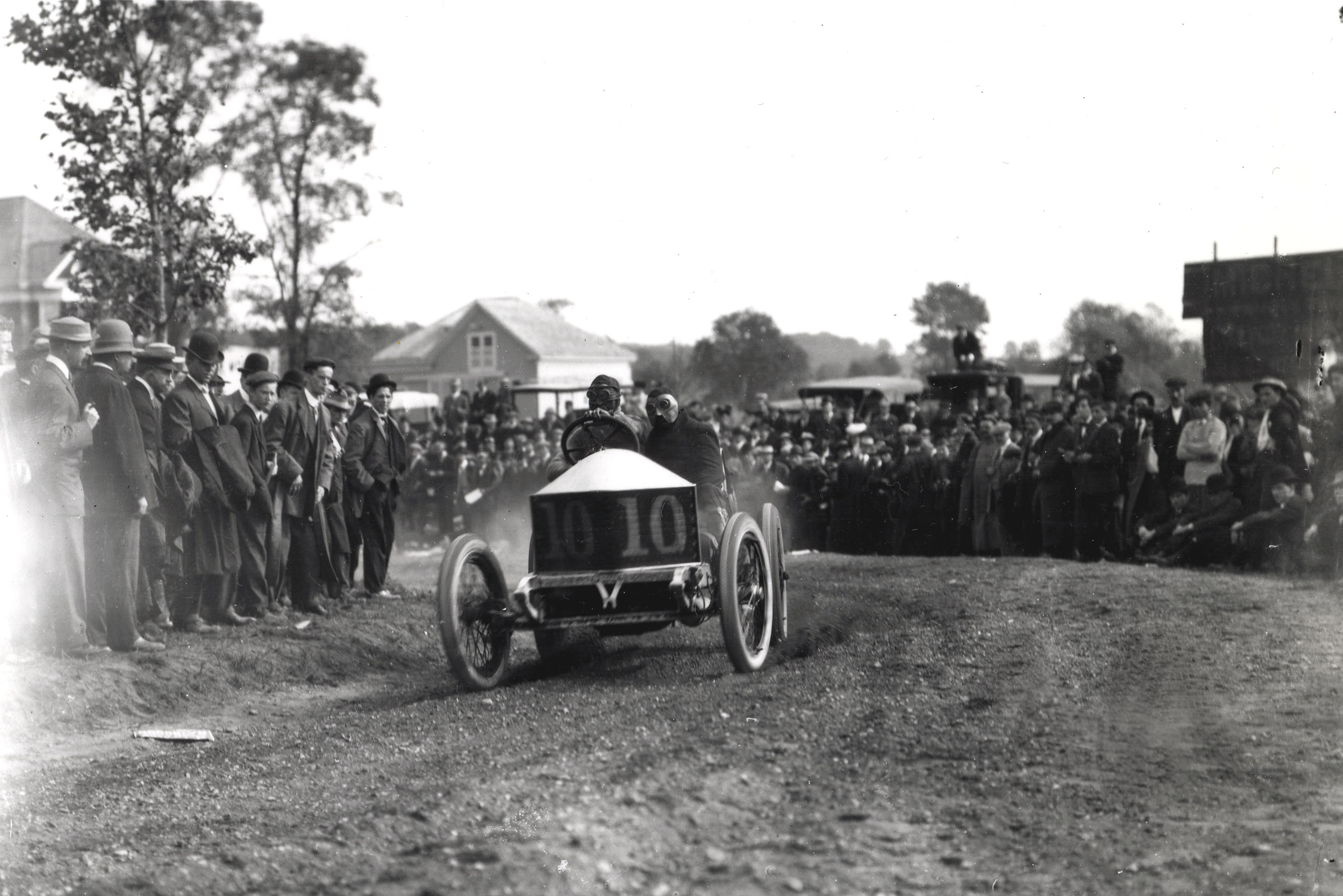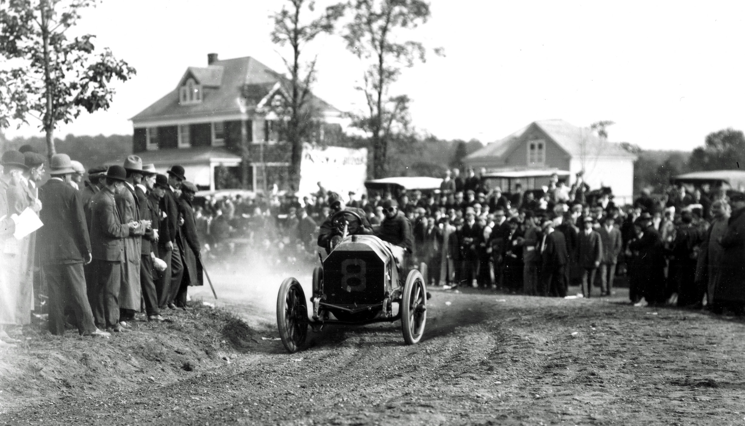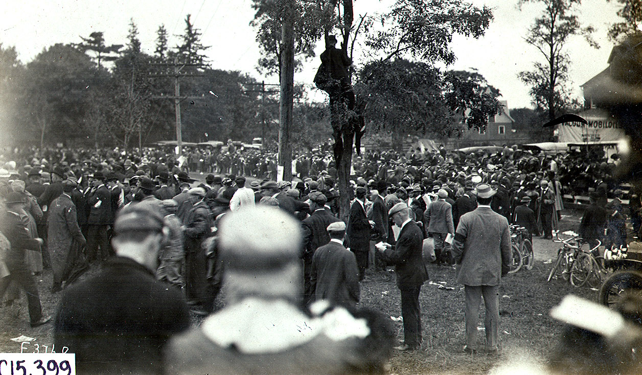 One of the most photographed locations for the 1906 Vanderbilt Cup Race was the Hairpin Turn in Old Wesbury. As a result, images of this the beautiful home at #1 Wheatley Road and hundreds of excited spectators on its lawn were captured during the race. Sadly, this Vanderbilt Cup Race course landmark was taken down this year.