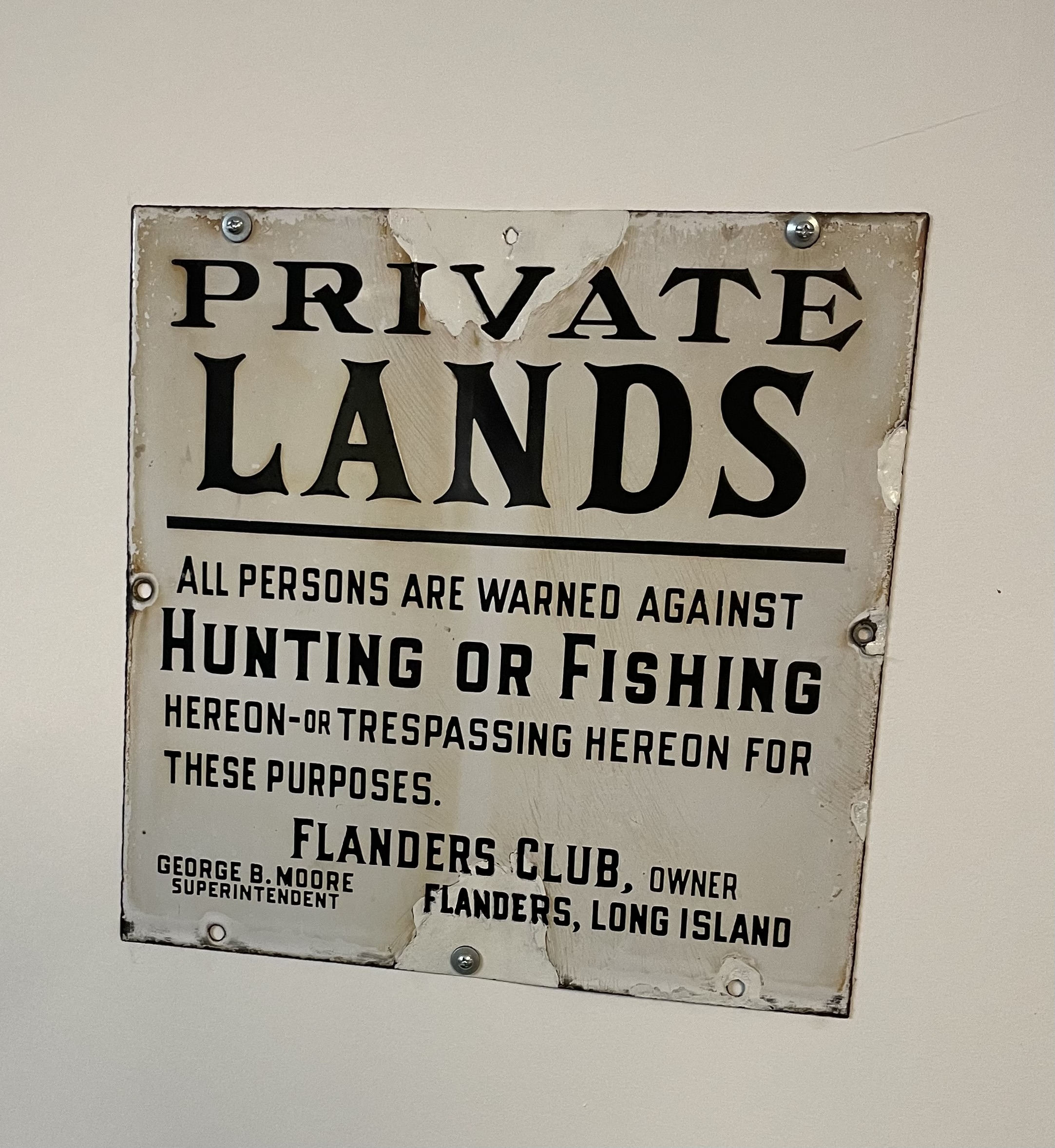 The Flanders Private Lands sign was found on the ground in some woods back in the 1950s by a friend and picked up and saved from time and weather before it had a chance to really rust away. It too is porcelain steel. I think I recall paying $20 for it.