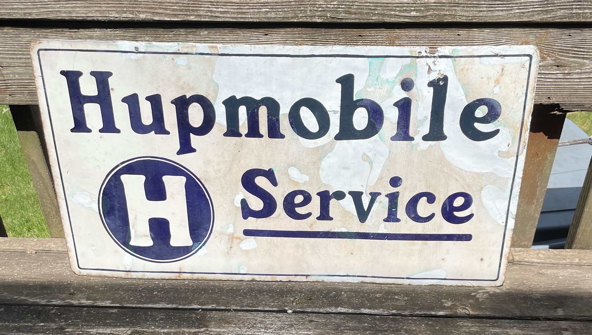 The Hupmobile sign is porcelain and has seen a lot of wear but is approximately 90 to 110 years old. . It is double sided so was made to hand so it could be viewed from both sides, probably from chains that went to a bracket extending from a wall.