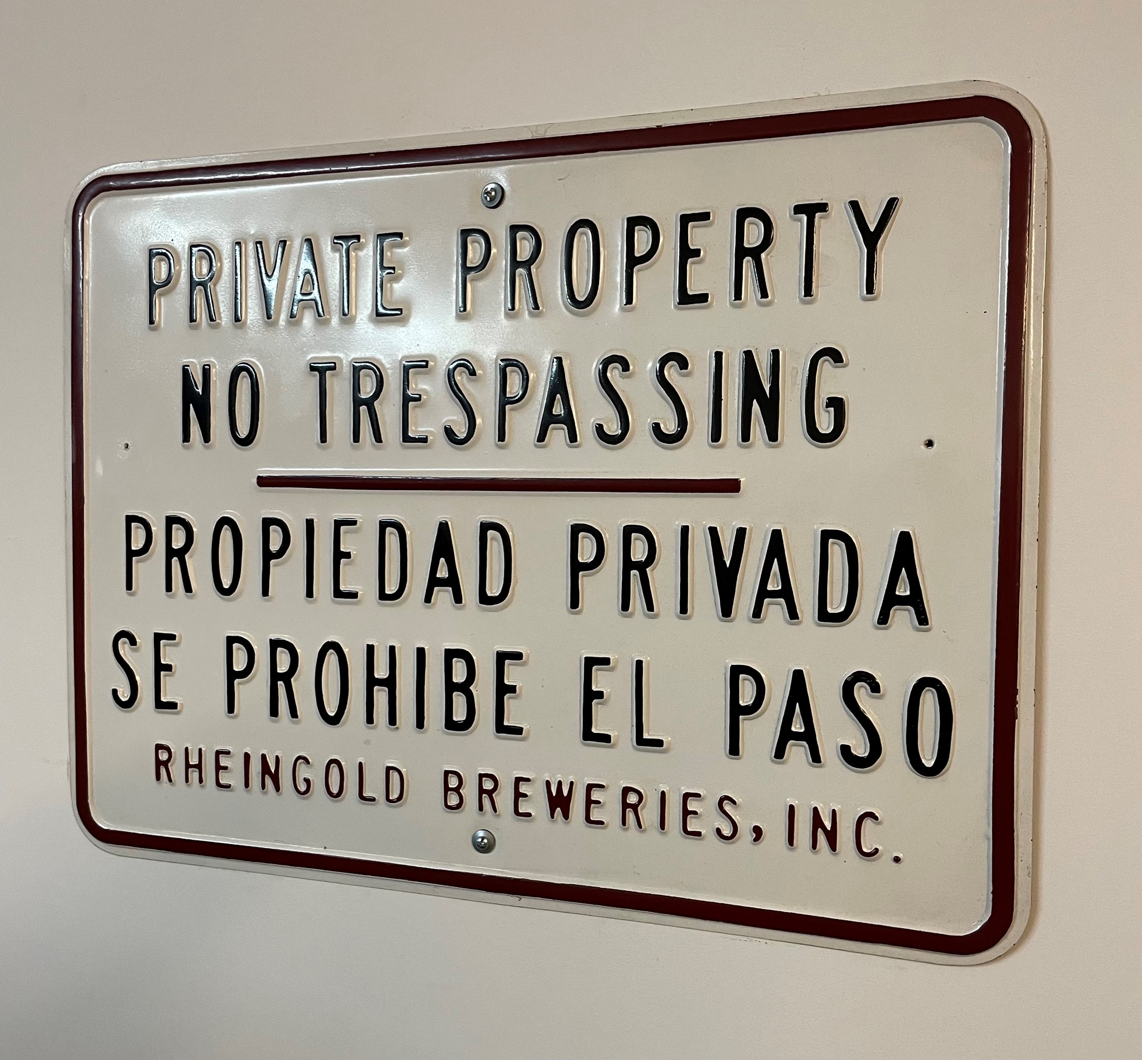 The Rheingold sign is painted steel with raised pressed lettering. 17 x 24 inches . It was attached to a fence or building in Bushwick section of Brooklyn where "the dry beer" was brewed. There are those reading this that may recall the annual "Miss Rheingold" contest that existed from 1940 to 1965. I recall photos of the competitors hanging from a string each year in the local delicatessen that also had an area where I could go to by packs of baseball cards and candy dots.