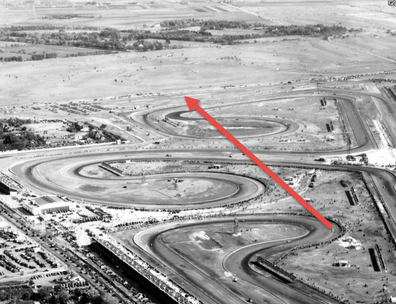 Above the Roosevelt Raceway grandstand in the right corner, you can find the Meadow Brook Lodge and Merrick Avenue Motor Parkway Bridge.