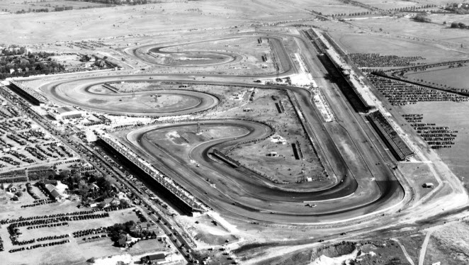 The new Roosevelt Raceway as seen during the 1936 Vanderbilt Cup Race. Look closely and you can see the racers on the track.