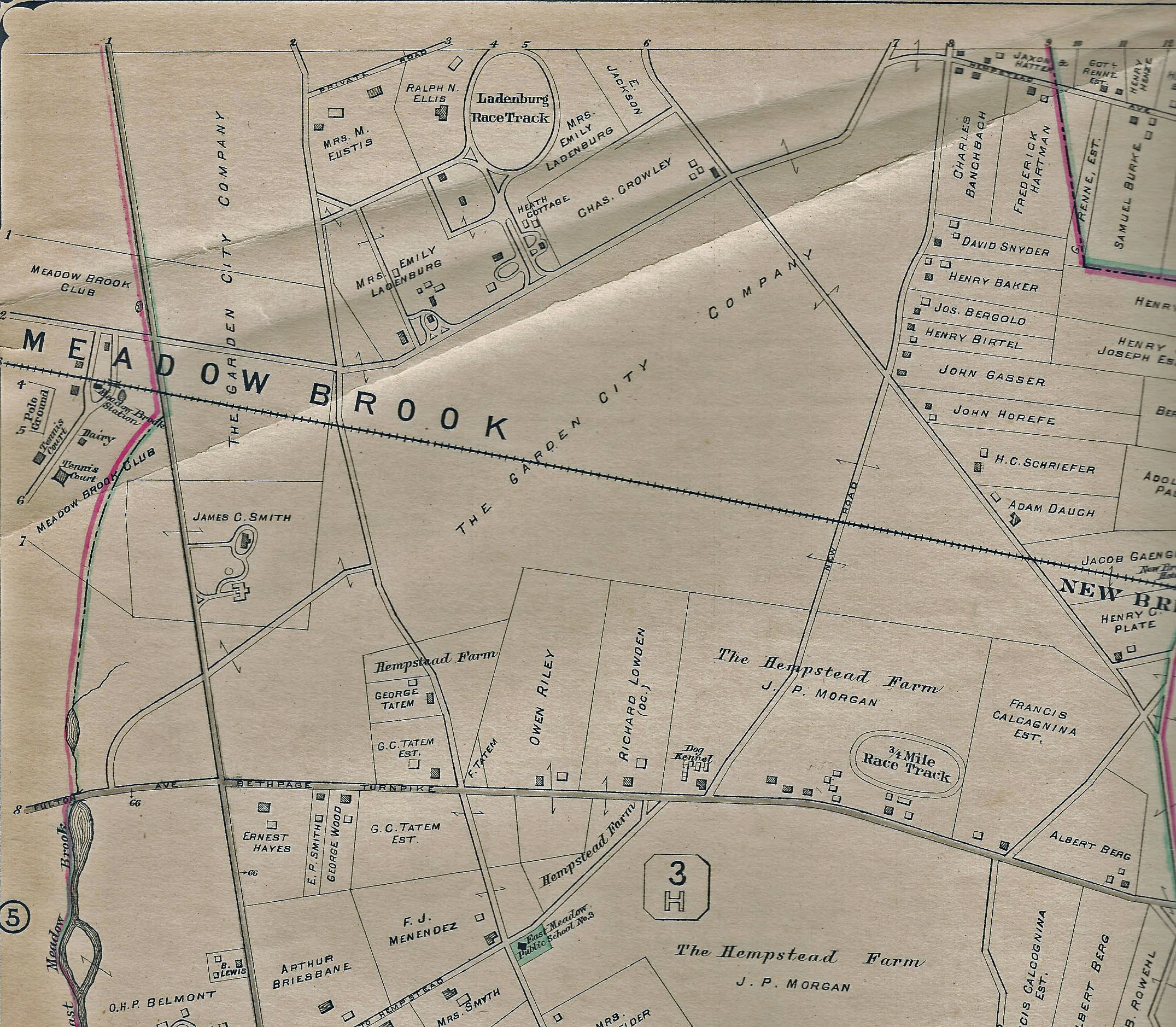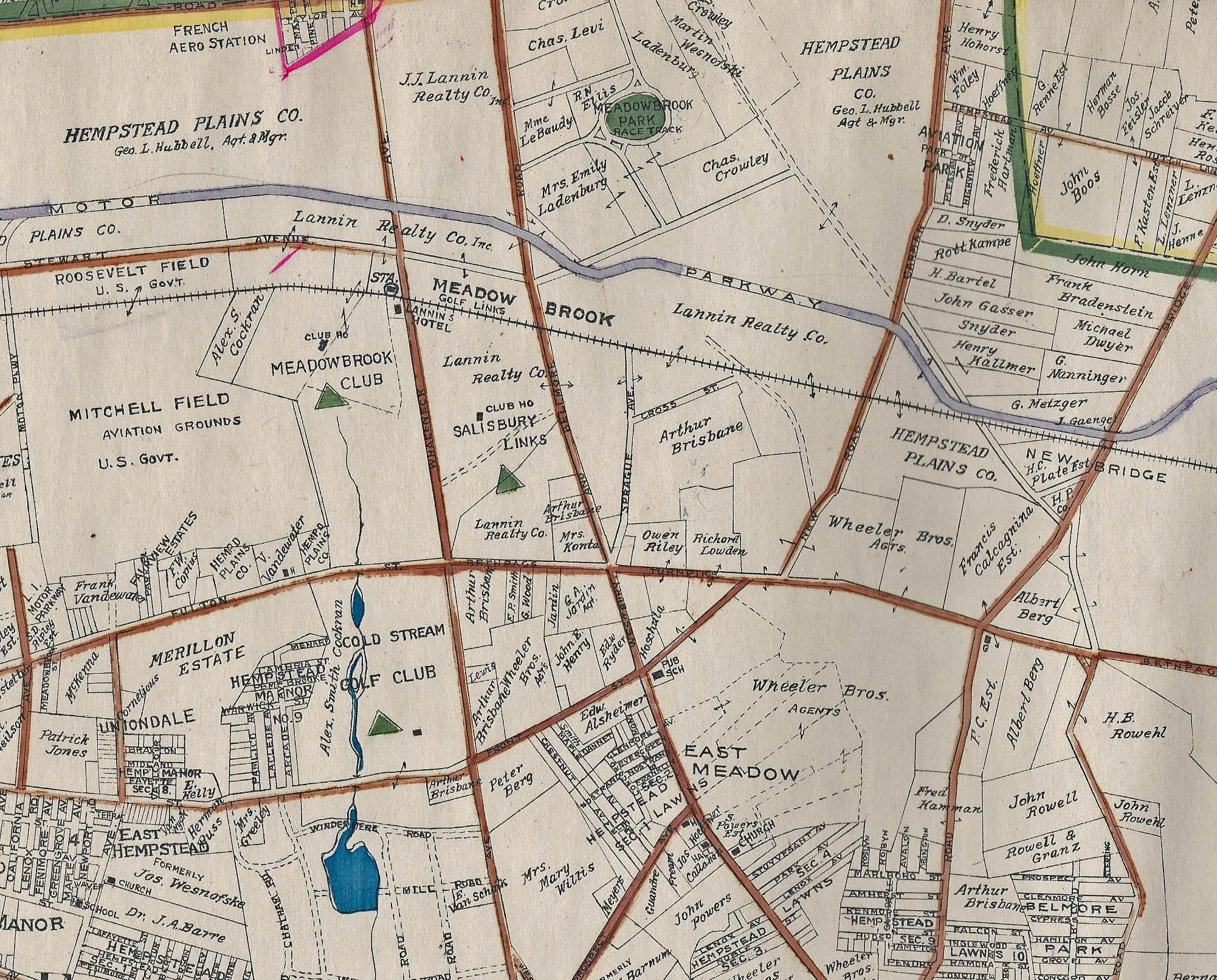 Hempstead (Bethpage) Turnpike is the major road across the bottom and Merrick Avenue is the north/south road on the left. The Central Railroad runs across the middle of the map through much of the property owned by the heirs of A.T. Stewart (The Garden City Company.)