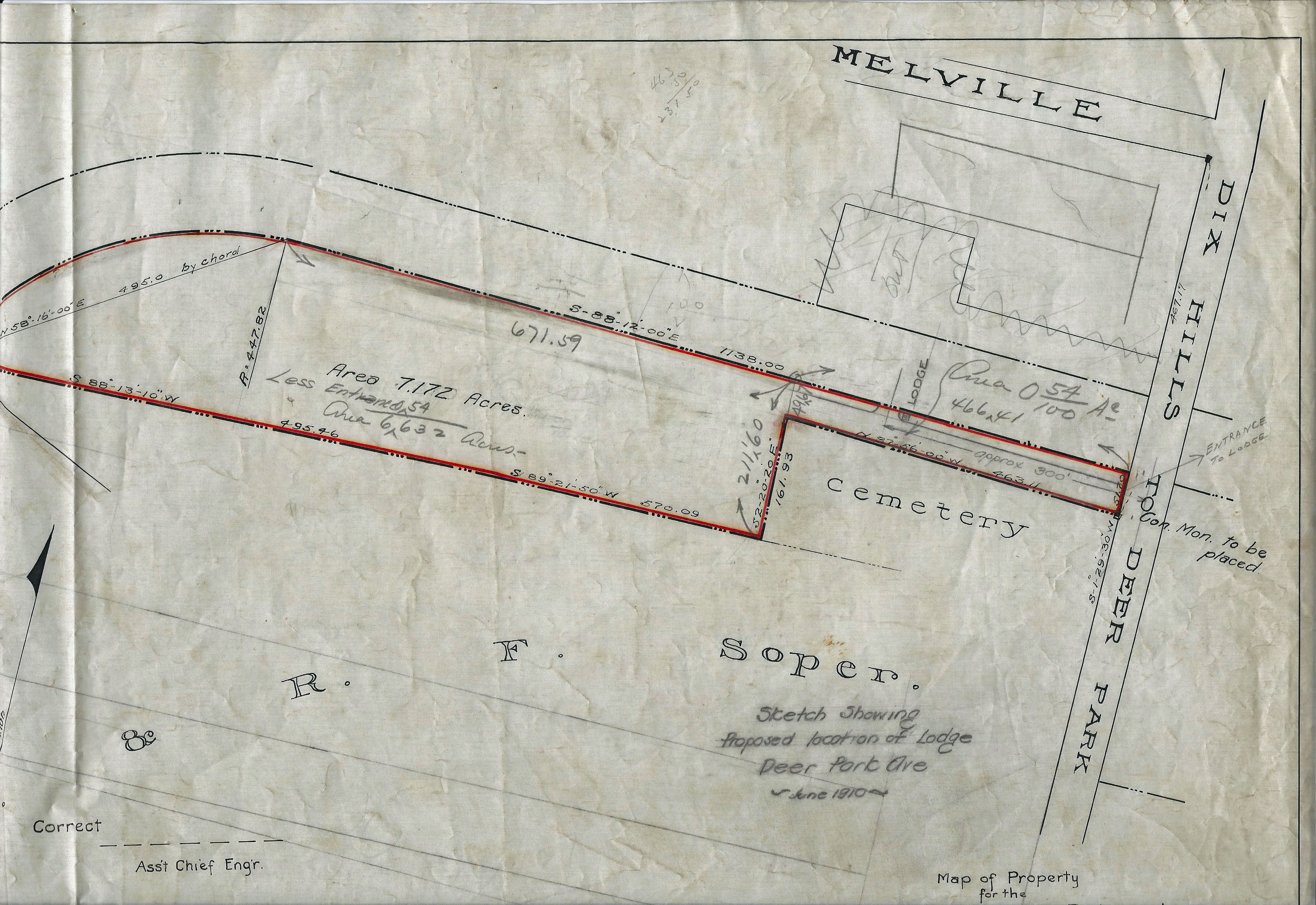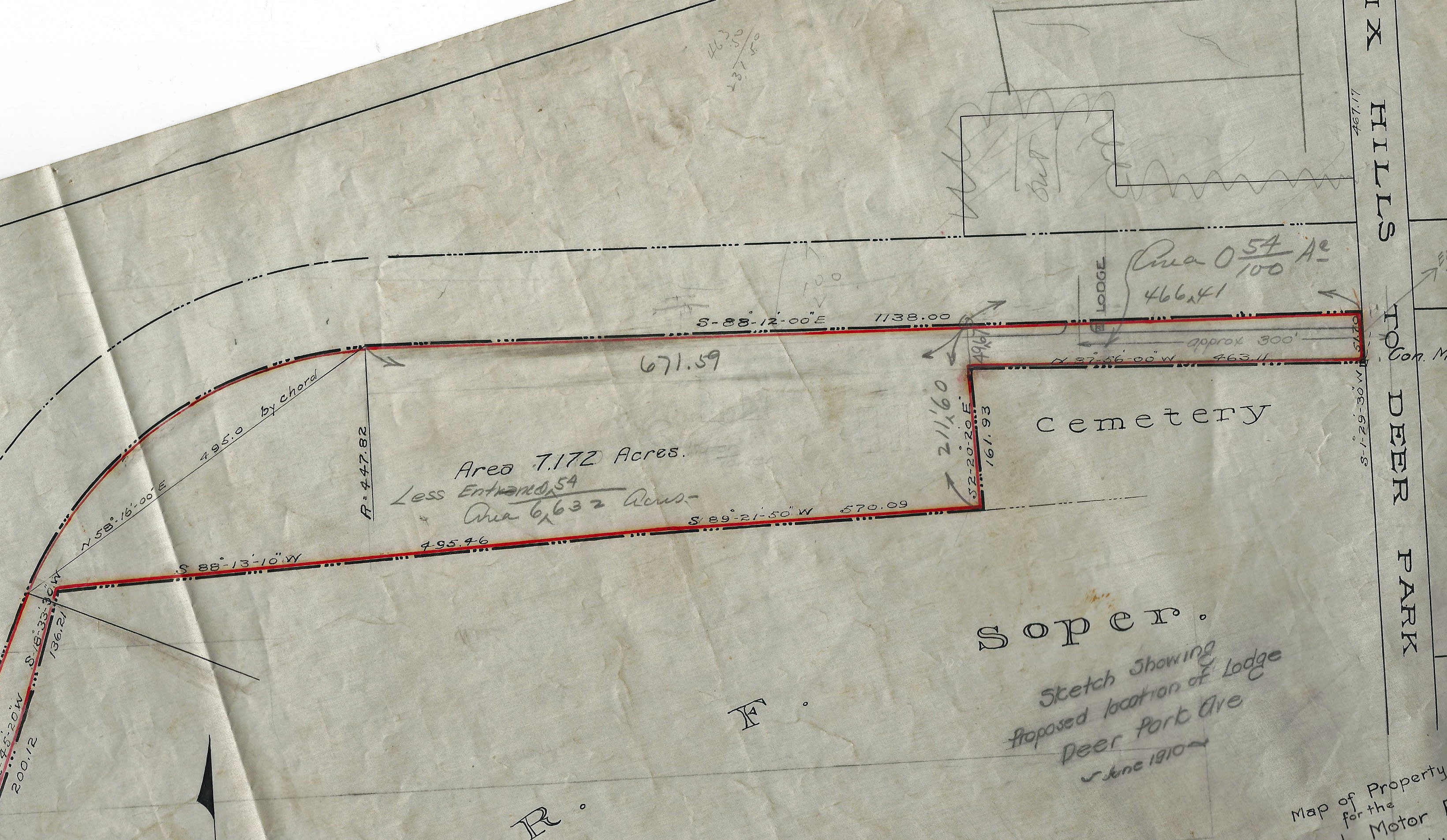 The survey was revised in June 1910 showing the handwritten notation "proposed location of Lodge Deer Park Avenue."
