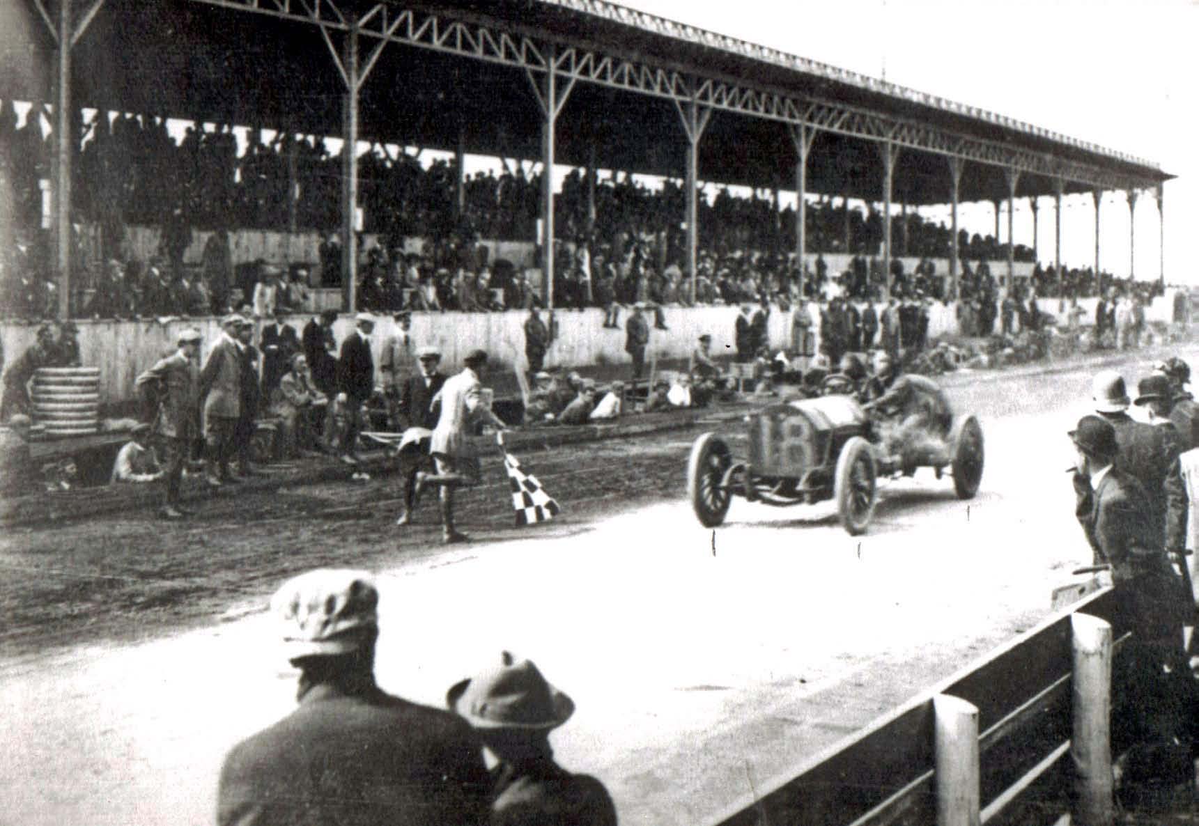 The 1908 race was held over the same course as the Motor Parkway Sweepstakes. In conjunction with the construction of the Parkway, a grandstand with a capacity of 5,000 spectators was built on the Hempstead Plains in today’s Levittown. This race was won by an American, George Robertson, driving a Connecticut-made Locomobile. For the first time America could finally boast of victory in an auto race against international competition. The crowd that year was estimated at over 200,000 spectators along the 23.46 mile course