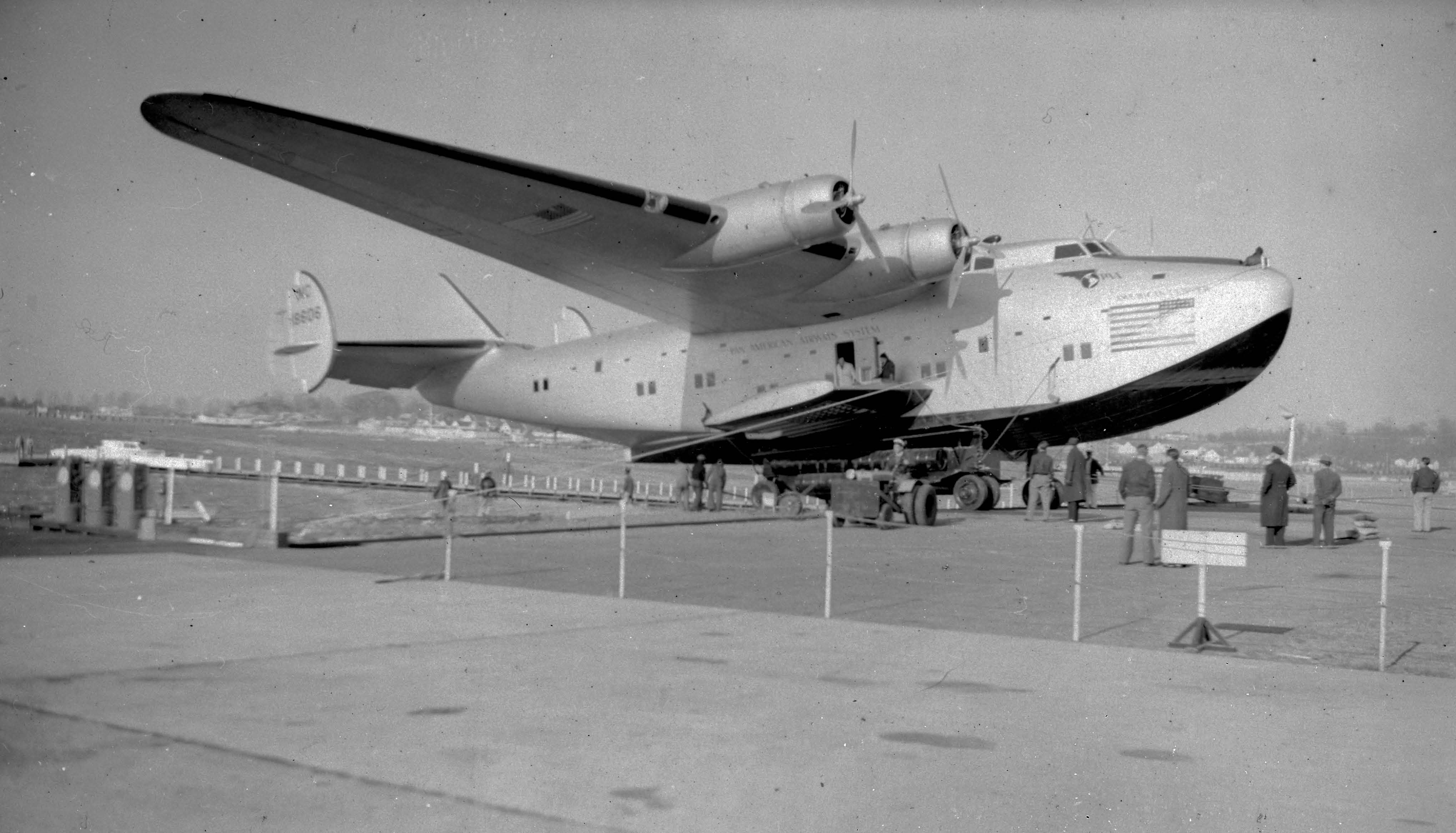 Joel Friedman (Volunteer Archivist and Docent- Cradle of Aviation): NC-18606 “American Clipper” was delivered by Boeing in June, 1939 served in the Atlantic. Pan-Am moved to the Marine Air Terminal in March of 1940. Their first flight to Europe was March 31, 1940 from the new facility. It was sold to the US Navy in 1942 crewed by Pan Am pilots, flew route to Lisbon, Portugal ( Portugal Neutral in WWII) via the Azores. Sold after the war and scrapped in 1950.