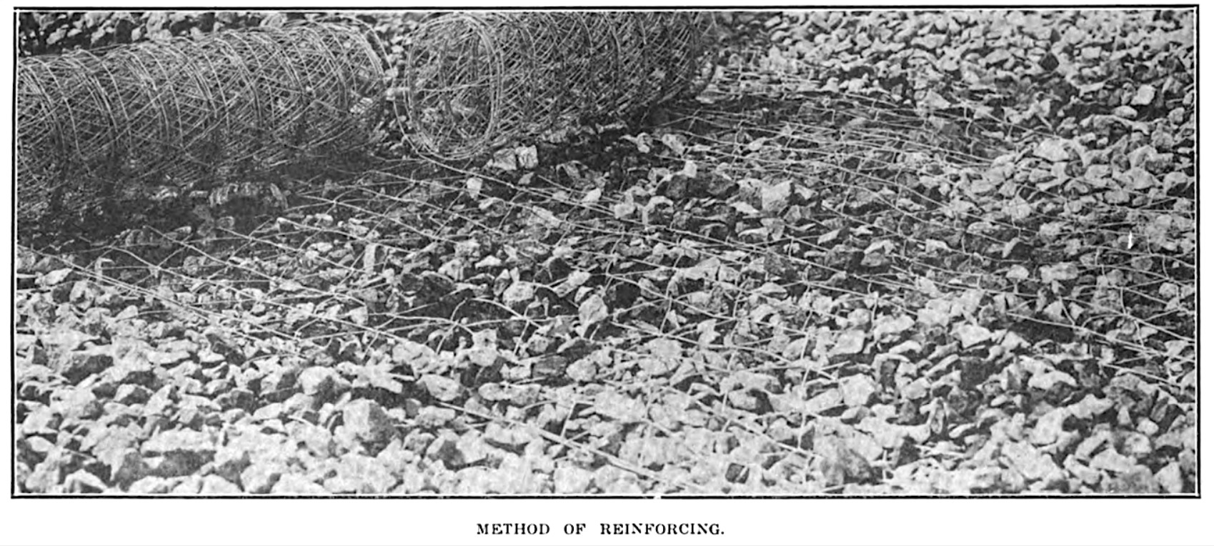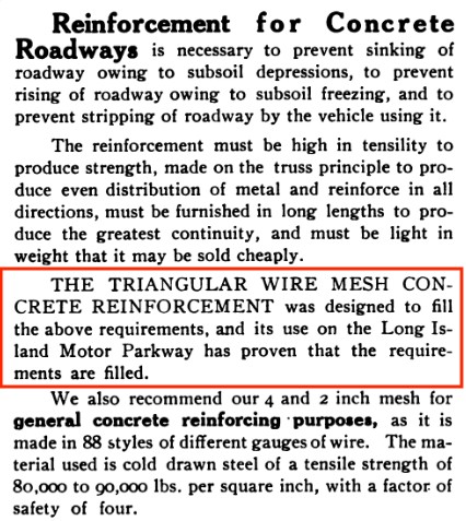 To ensure longevity and weather conditions that hampered early dirt and macadam roads, the use of reinforced concrete was thought to be the answer for minimal road maintenance. Reinforced concrete is still the main roadbed for today's modern highways.