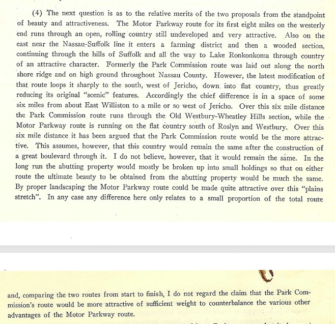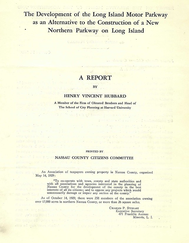 In a 1929 report by Henry Vincent Hubbard of the Olmsted Bros. firm, Hubbard argues for the use of the Motor Parkway instead of a new, planned planned Northern Parkway due to its much more scenic views.