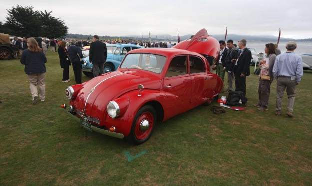 This car was shown as part of the postwar preservation class at Pebble, one of our favorite groupings that covers unrestored cars. It was bodied by Walter Kong, a Swiss coachbuilder who purchased the car himself to show off his talents at the 1949 Geneva auto show. Kong reached back a couple of decades for the Art Deco shapes and lines, and he also found inspiration in aeronautics. The roof has four separate clear panels, two of which are removable and replaceable by light-diffusing silk cloth. Kong intended to put the car into production, but the handmade details that make it so amazing today meant it was too expensive for that period, and it remained a one-off.