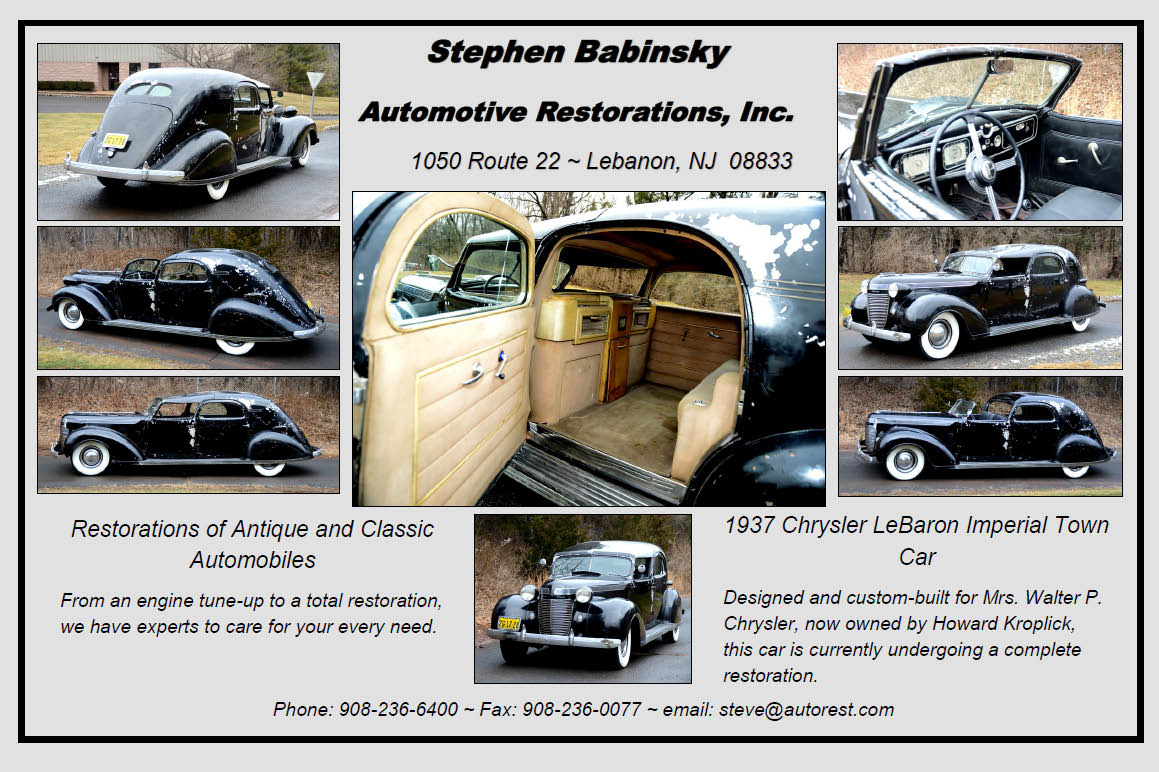 Historian and coachwork specialist Walt Gosden has been providing reports on the restoration of the 1937 Chrysler's Chrysler at Steve Babinsky's Automotive Restorations, Inc. in Lebanon, New Jersey. The third article highlights an amazing discovery about the car- a one-of-one 1937 Chrysler Imperial C-15 Town Car custom built by LeBaron for Della Chrysler, the wife of Walter P. Chrysler.