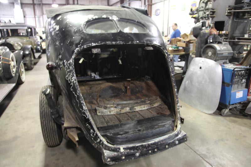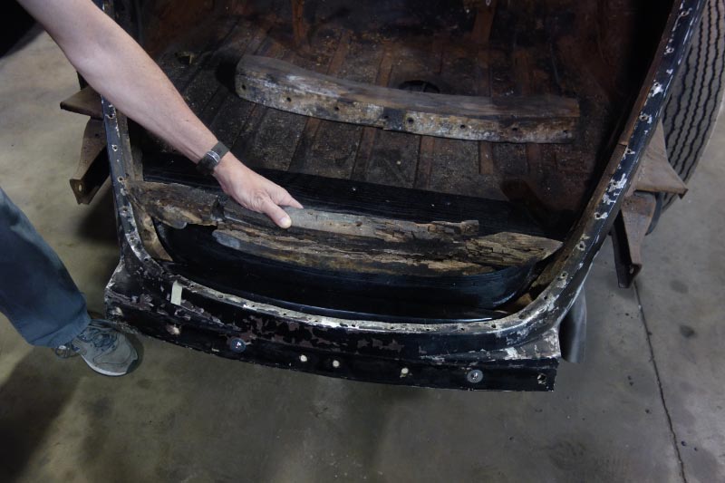 The ribbed steel floor pan starts at the front of the rear wheel arches and continues to nearly the end of the back of the trunk area.Note in the 3/4 rear view of the passenger side of the body how the chassis/frame ends (the tail pipe is just below) but yet the body extends beyond by at least another 15 + inches. This whole tail section of the body is also framed out in ash wood.