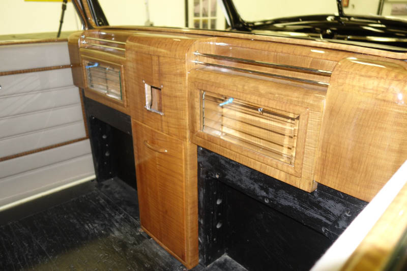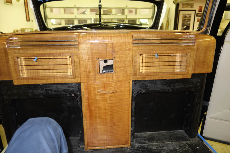 The rear vanity/division partition woodwork has been restored and reinstalled. The wood is quarter sawn flame tiger maple. The clock will be mounted at the center.