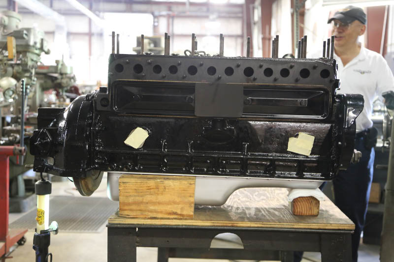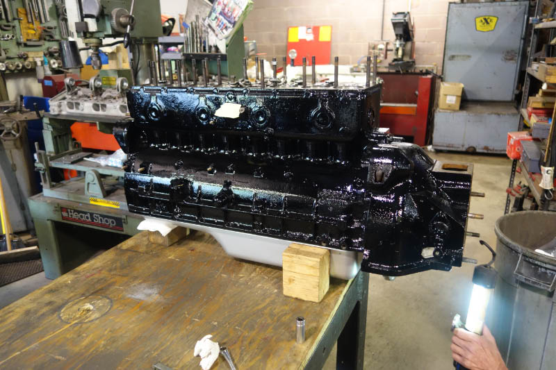 The main engine components (pistons, rods, crankshaft, and cam ) have been assembled back into the block and the oil pan has been refitted as well.
