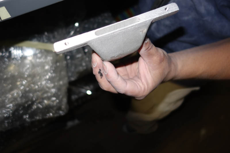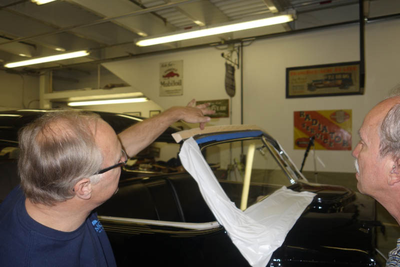Steve Babinsky shows Walt the header piece they have created to fit the top of the windshield. This is part of the unit that will allow a black waterproof fabric cover to be snapped in place for inclement weather when the solid metal panel cover is not in use.