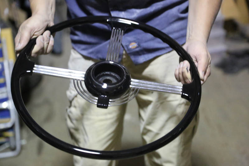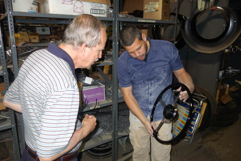 Mike shows Walt the finished steering wheel that we viewed being worked on in the last report.