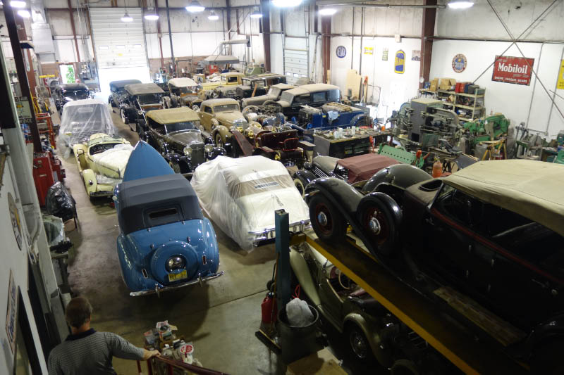 Over all view of the cars currently in the shop . The bright blue convertible is a Lincoln Continental that was owned when new by famous pre-WWII band leader Paul Whiteman. He was the man who commissioned and paid composer George Gershwin to write "Rhapsody in Blue" as sen in this rather odd 1930 film.
