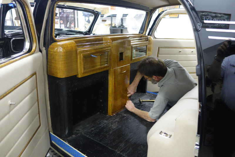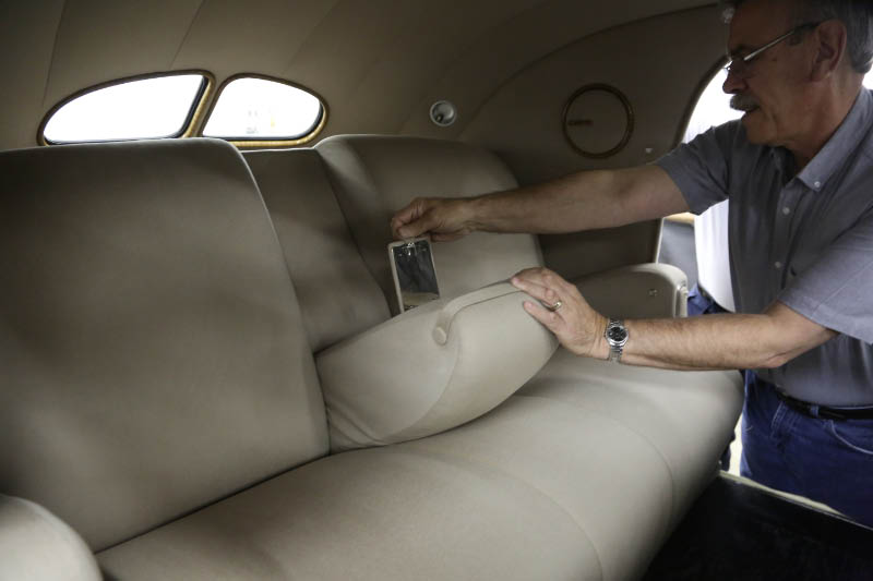 Master upholsterer Bruce shows the ash tray location in the center of the rear arm rest.