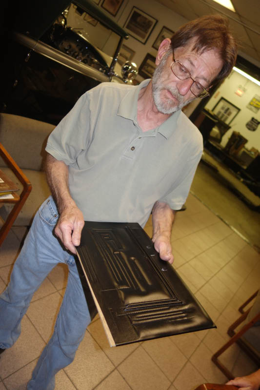Master upholsterer Jim, holds a sample panel of stitched leather created to determine the various patterns and widths needed for the front interior door panels before the actual sewing of the large door panels began.