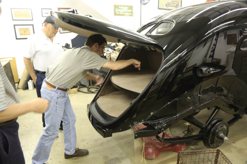“The right rear quarter panel shows - - - “, etc.; what that pic shows is what I recall as the inner disc lid of the hidey-hole that allowed Della to peek out at the world outside, unobserved, through the small grilles on the outer panels. You never confirmed (or denied) this. Also, for a life-long classic car afficionado (and former ‘31 Imperial owner), “Over all view of the cars currently in the shop” is truly a glimpse of paradise! Sam, III