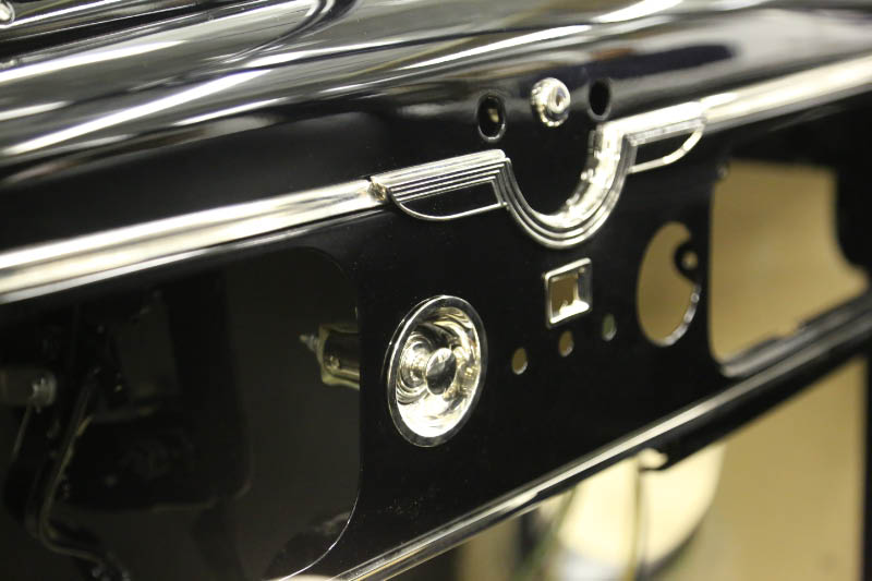 The nickel plated trim has been refitted to the dashboard and gauges are being reinstalled. Everything is of jewel like quality.
