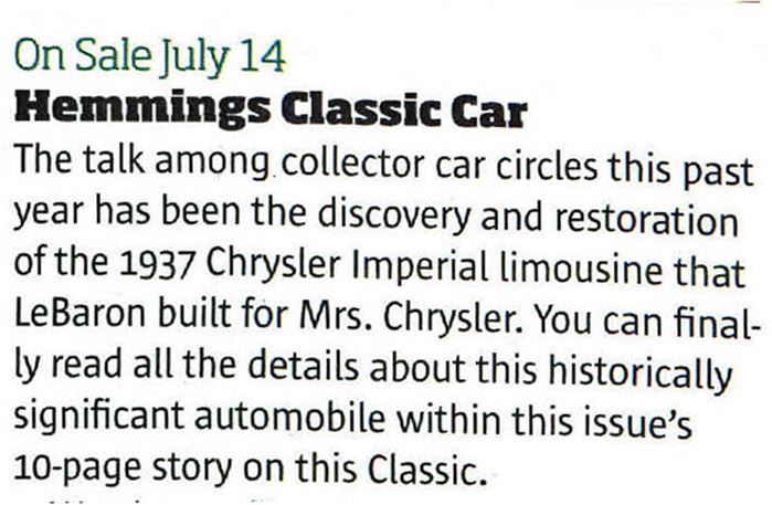 Kroplick first showed the unrestored Chrysler in June 2012, at the Greenwich Concours d’Elegance in Connecticut, where it won the People’s Choice award for the “ultimate barn find.” He began restoring the car in November 2013. Most of the work was performed by Steve Babinsky, who runs Automotive Restorations in Lebanon, New Jersey. Hemmings Motor News, in a feature on Babinsky, wrote: “Local owners and Pebble Beach contenders alike call Automotive Restorations for the world's most exacting restorations.”