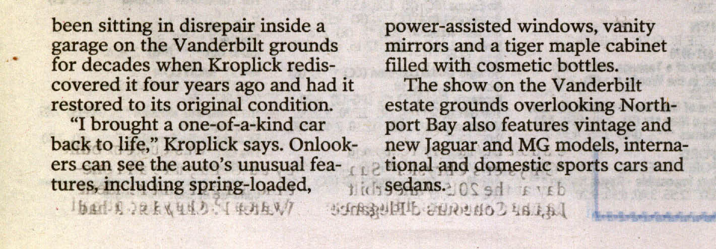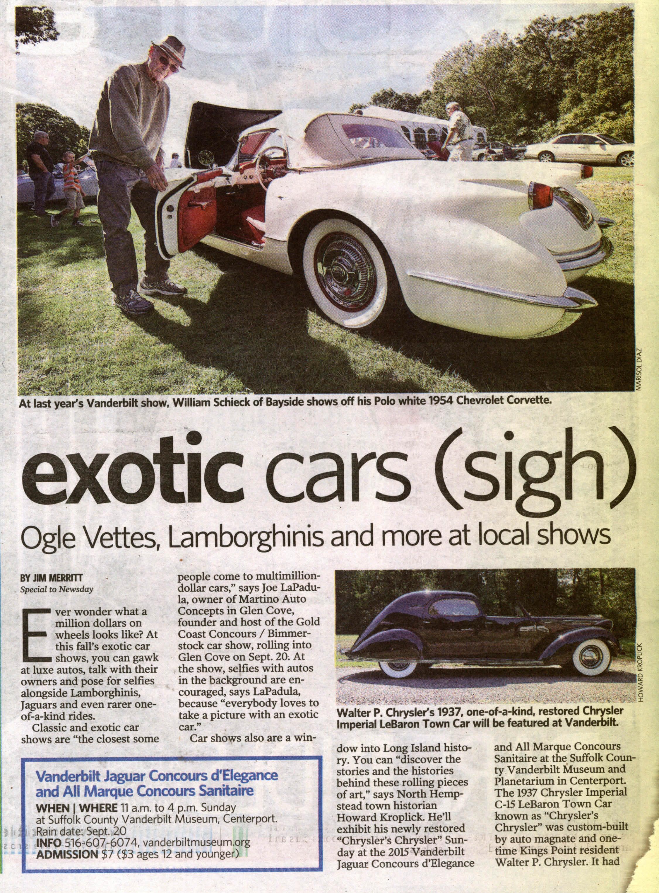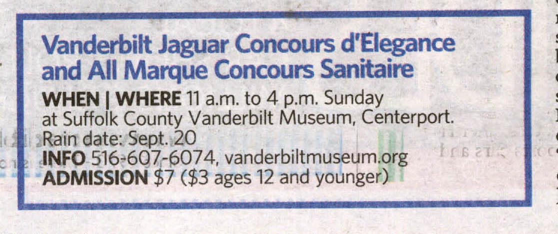 The rare automobile – built for Chrysler’s wife Della – will be the centerpiece of the annual Jaguar Concours d’Elegance and All Marque Concours Sanitaire, a show of classic automobiles presented at the Vanderbilt by the Jaguar Drivers Club of Long Island and the MG Car Club-Long Island Centre. The show will run 11 a.m. to 4 p.m. (Rain date: September 20.)