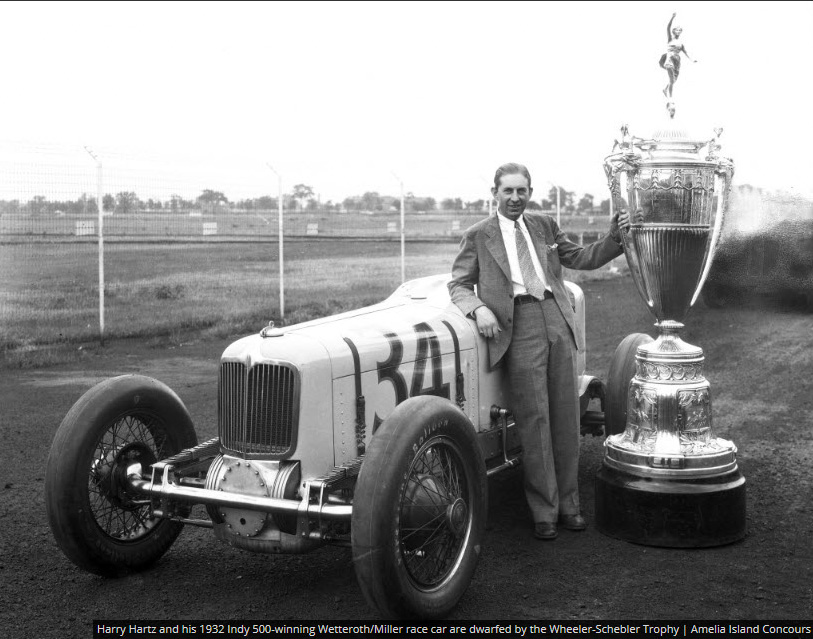 Harry Hartz and his 1932 Indy 500-winning Wetterorth/Miller race car are dwarfted by the Wheeler-Schebler Trophy. Courtesy of Amelia Island Concours.