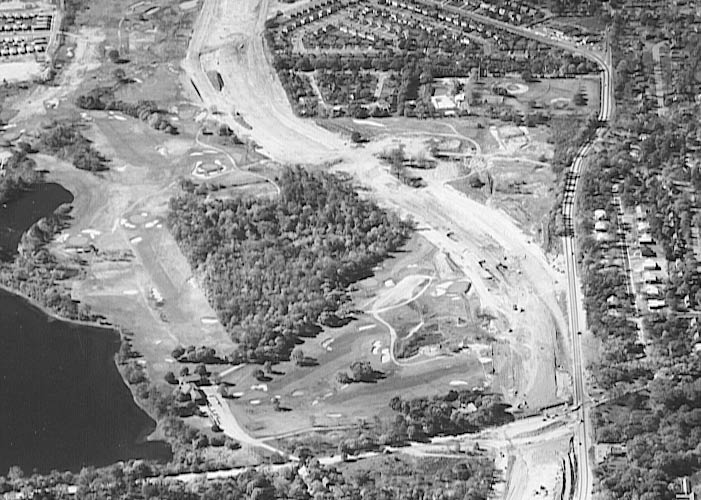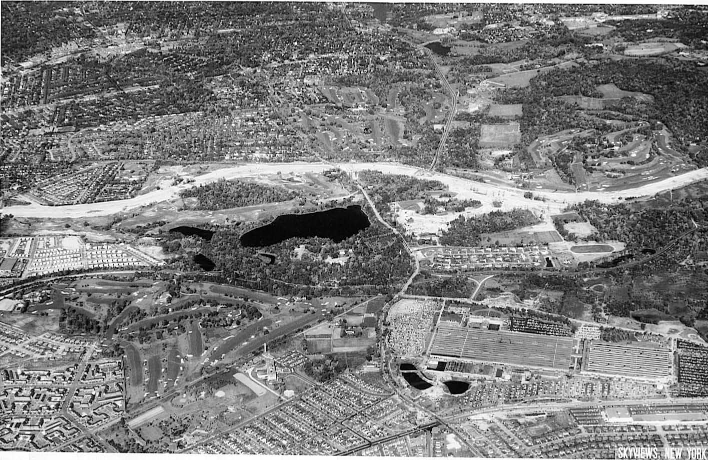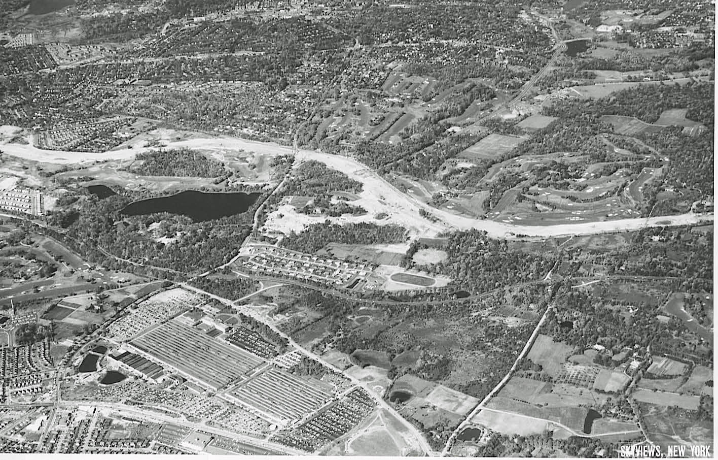 This aerial shows how the Expressway cut through the former Deepdale Golf Club. The golf club was created by William K. Vanderbilt, Jr. and his friends in 1924 on Lake Success property owned by Willie K.