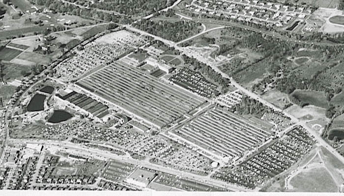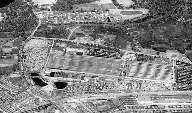 The huge 1.4 million-square-foot plant of the Sperry Gyroscope with filled parking lots for 22,000 employess.