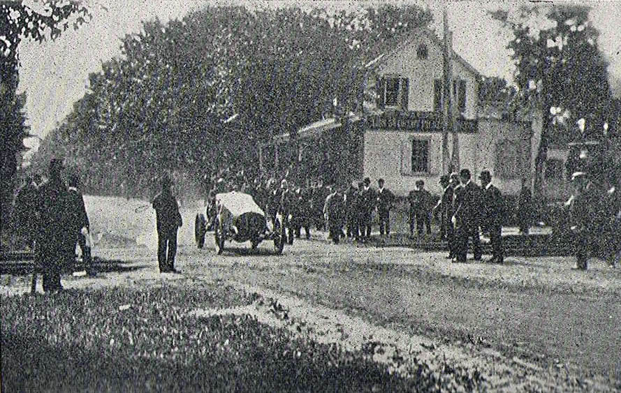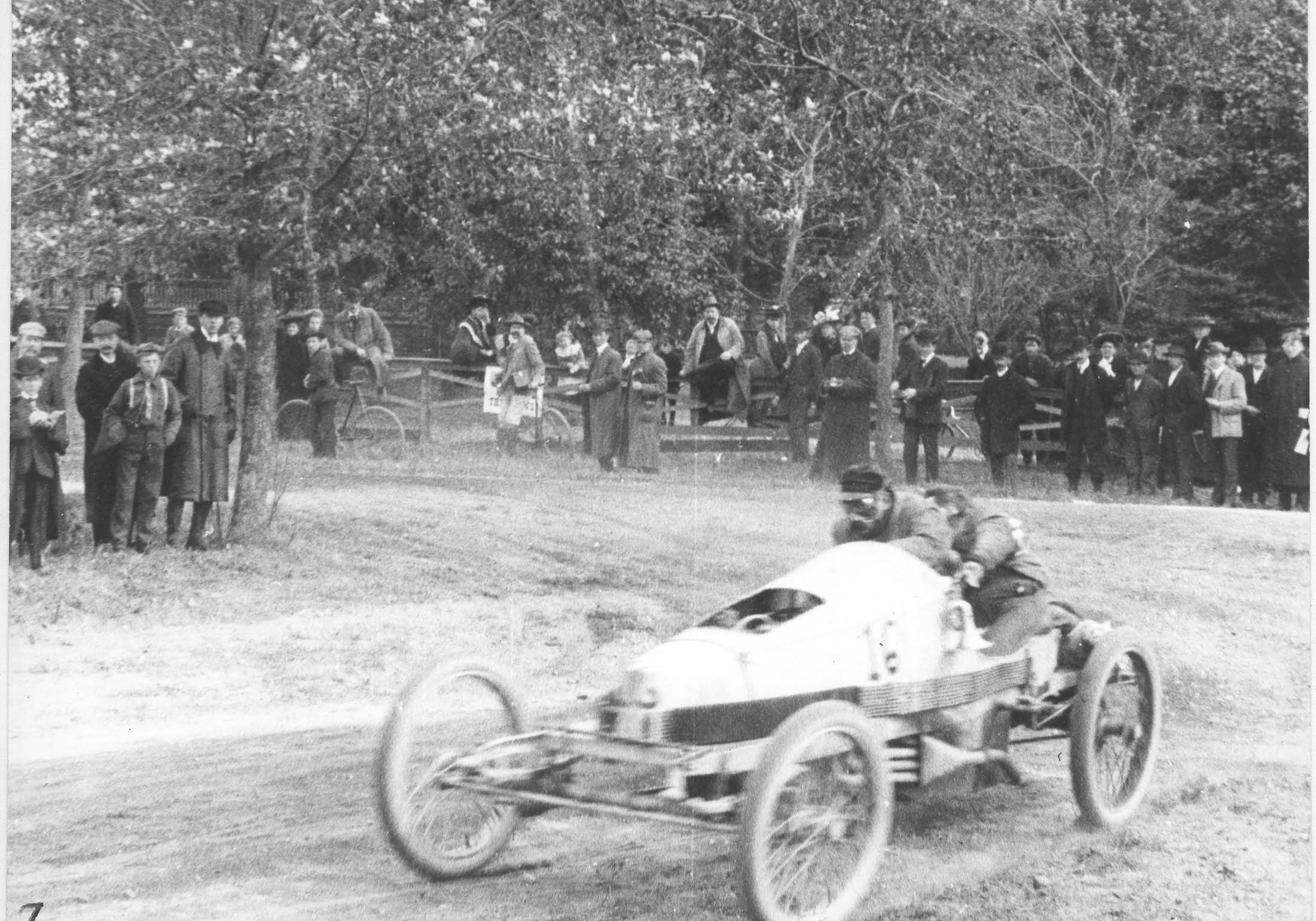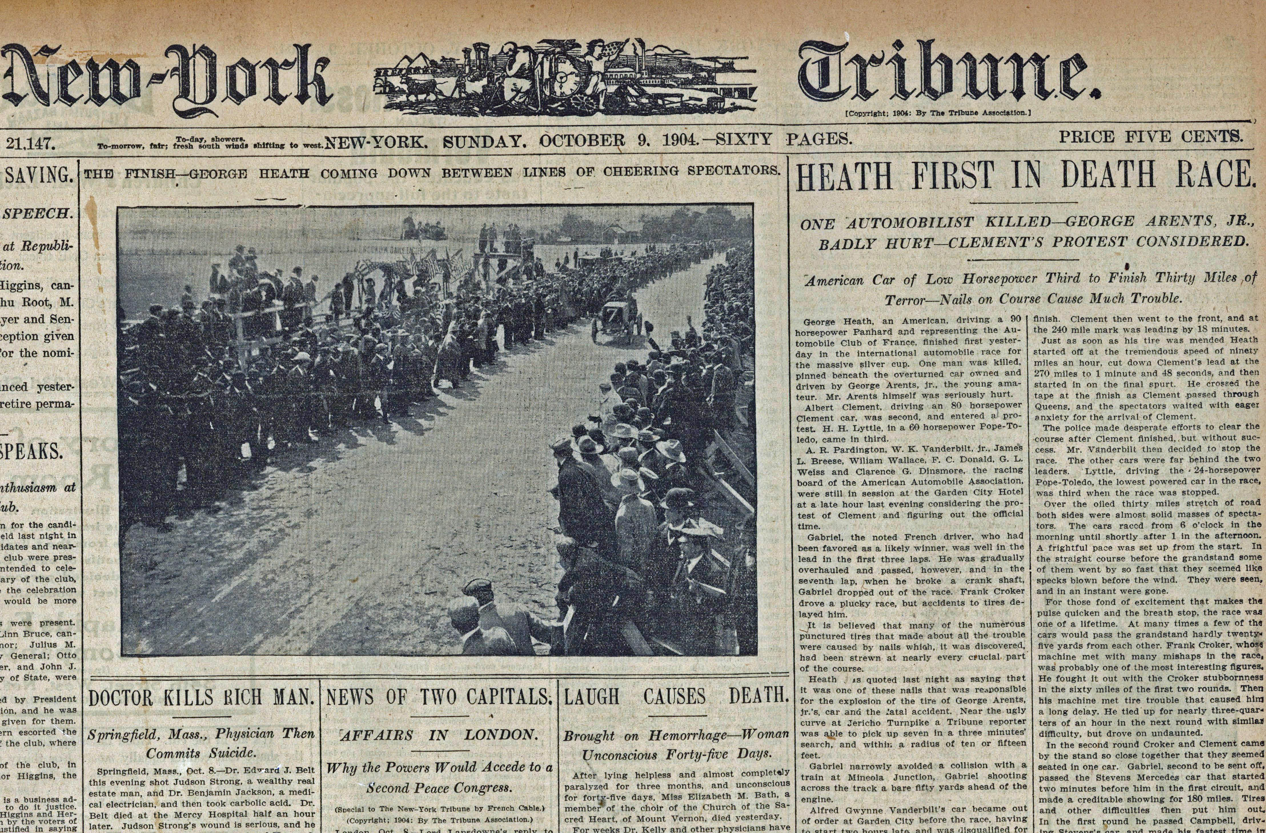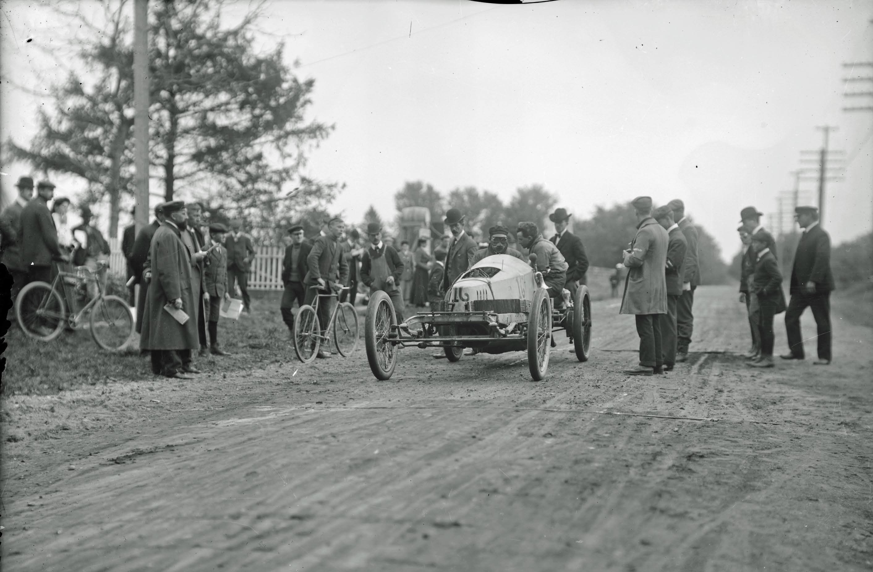 Attendance estimates for America’s first international road race ranged from 15,000 to 50,000 people, depending on the source. In an article for the October 13, 1904 edition of Motoring & Boating, William K. Vanderbilt, Jr. wrote, “I traveled the course twice and judge there must have been over 50,000 people standing at the roadside.” Motor Age acknowledged the wide range of estimates. “Some place it as low as 15,000, estimating the spectators as low as 500 per mile of the circuit. A program man, who sees big crowds and made a circuit of the course that day, puts the number at 50,000, declaring there was hardly a break in the line of spectators and that at each of the controls and towns were crowds numbering up in the thousands.”