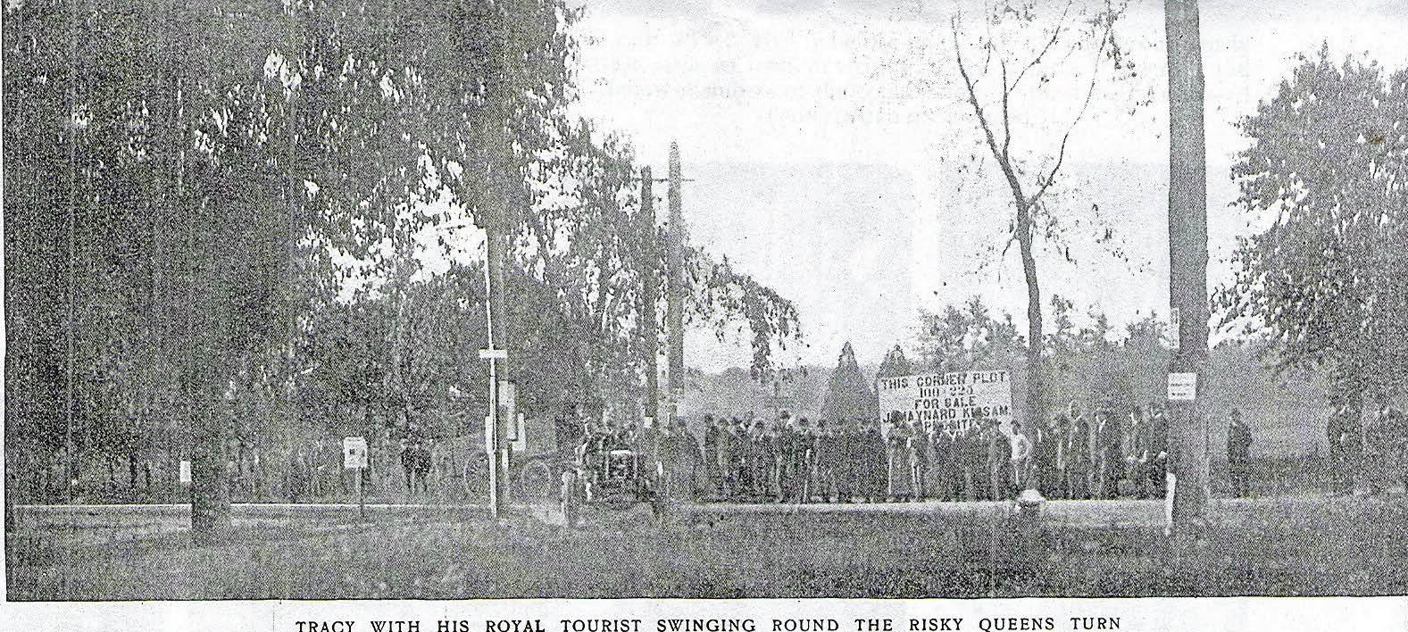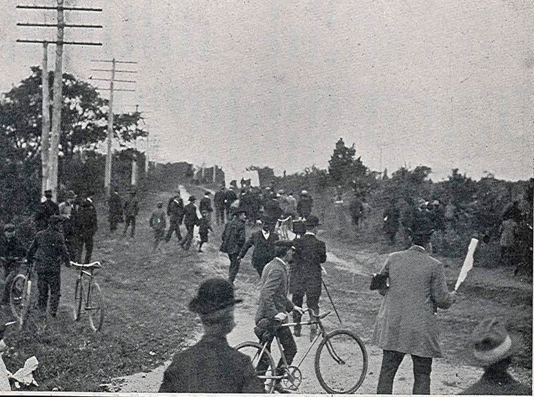 Just west of the grandstand, a large crowd stood on both sides of Jericho Turnpike to watch the race.