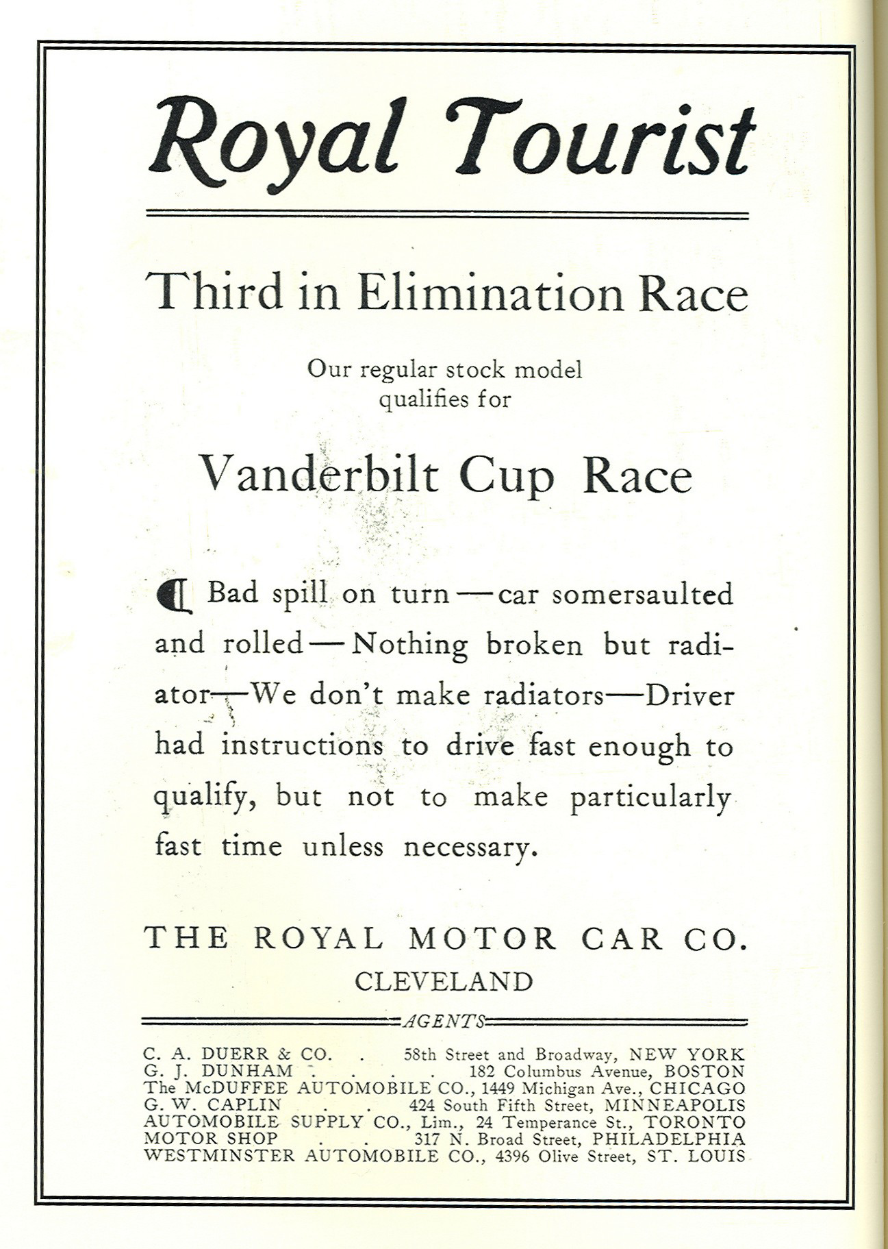 The Royal Motor Car Company placed this ad after its third place finish. "Bad spill on turn-car somersaulted and rolled- Nothing broken but radiator-We don't make radiators- Driver had instructions to drive fast enough to qualify, but not to make particularly fast time unless necessary."