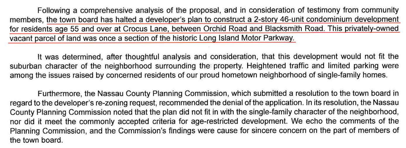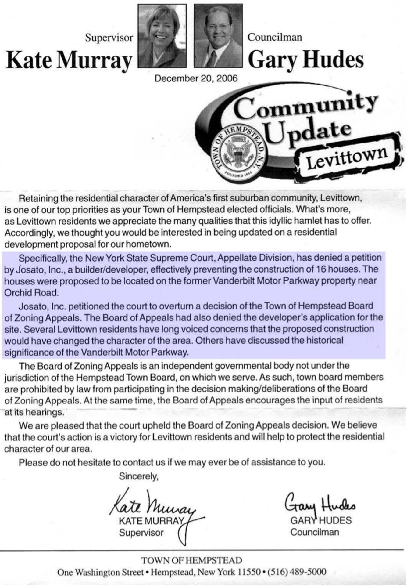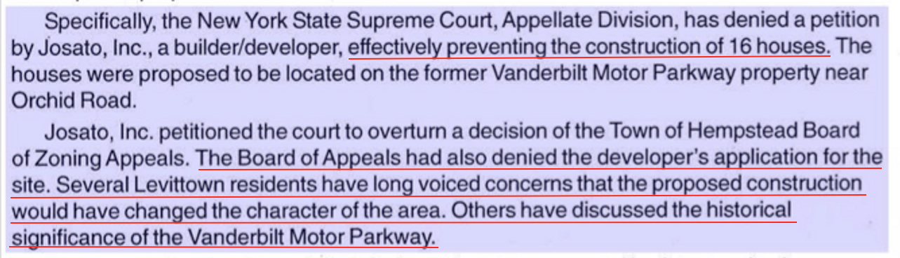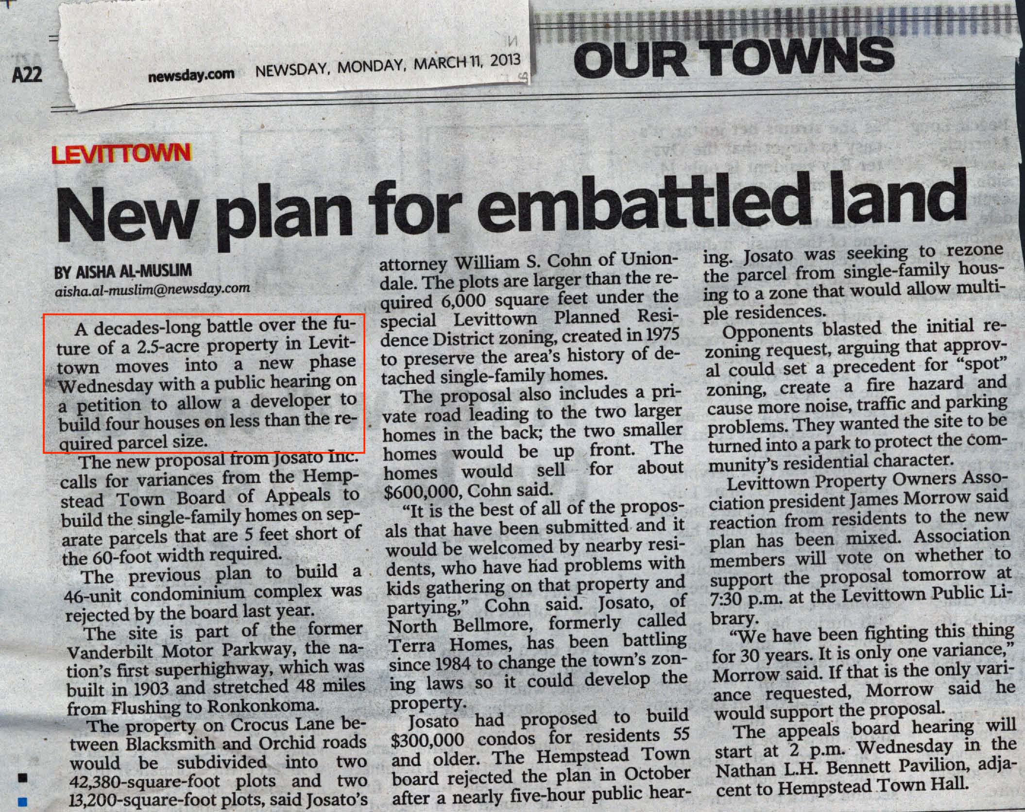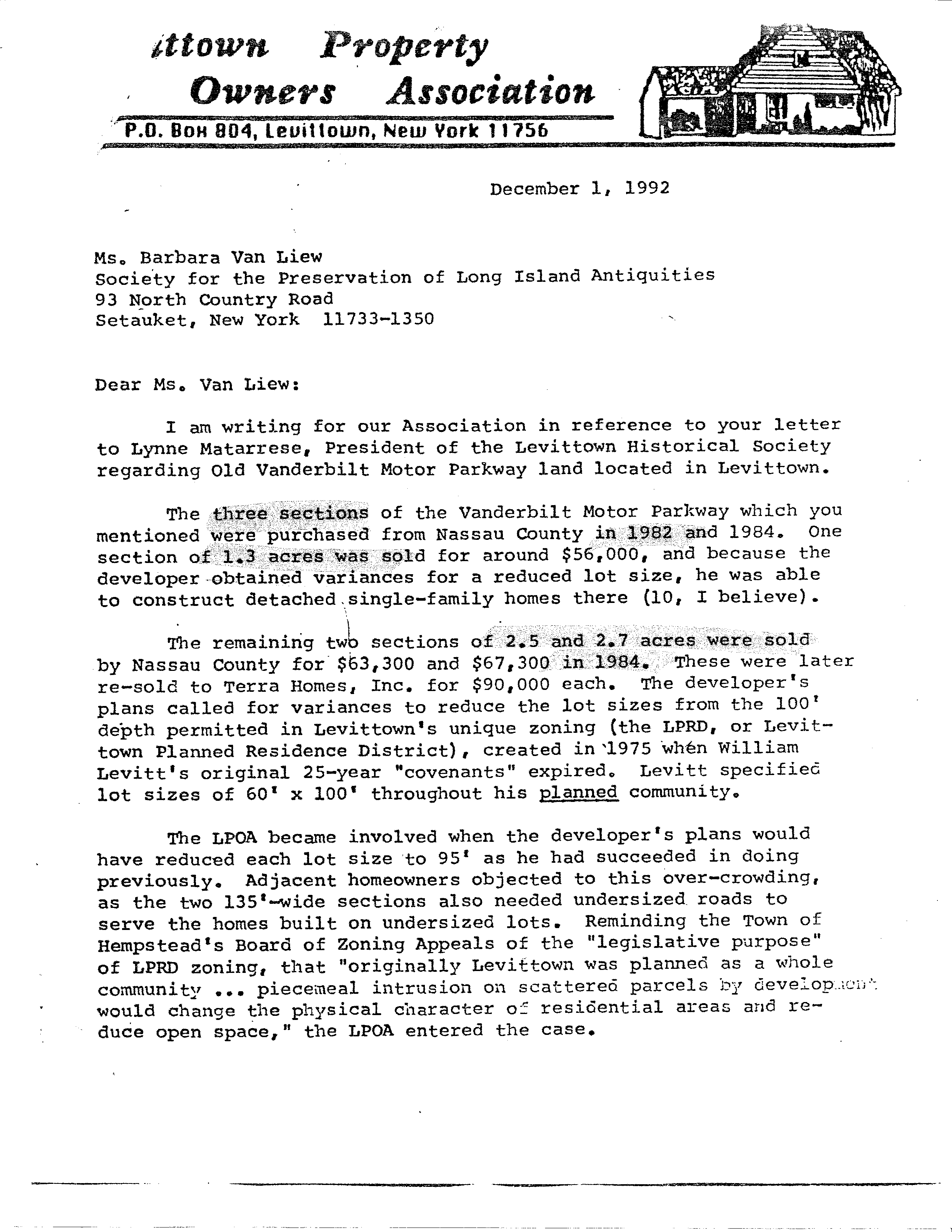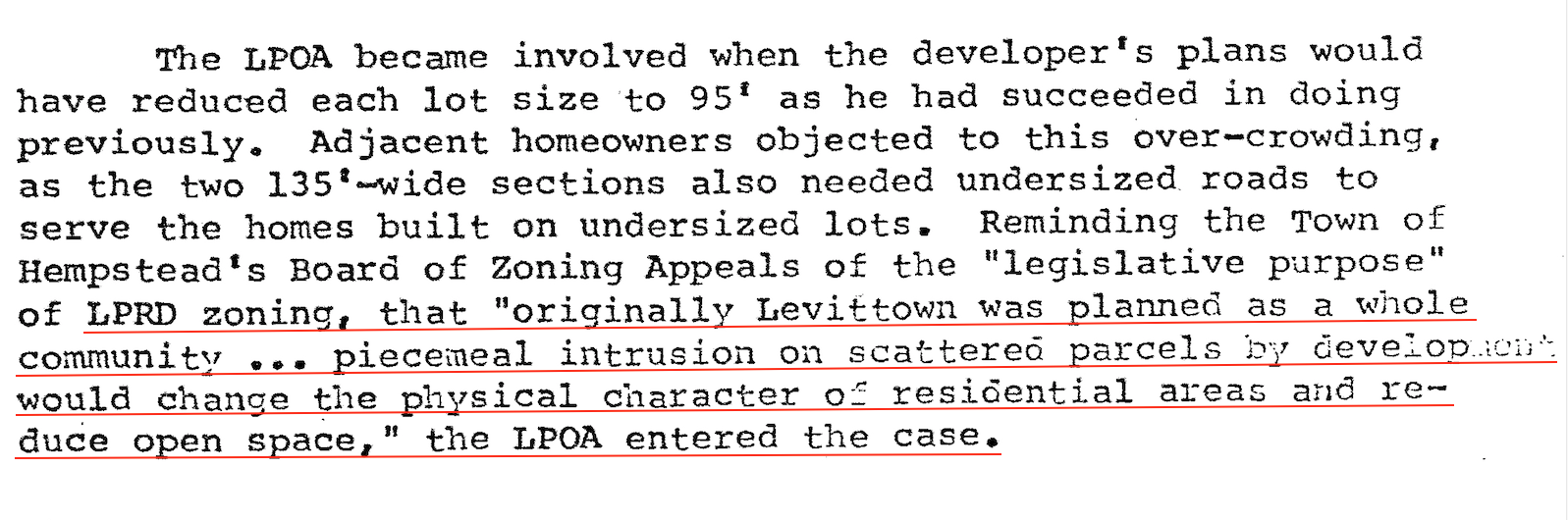 Eventually a developer did purchase some of the parcels but after successfully building a few homes, other developers would not be permitted due to zoning requirements and opposition by local residents. Following several court battles between the developer and local officials, The Levittown Property Owners Association (LPOA) voiced their concern.