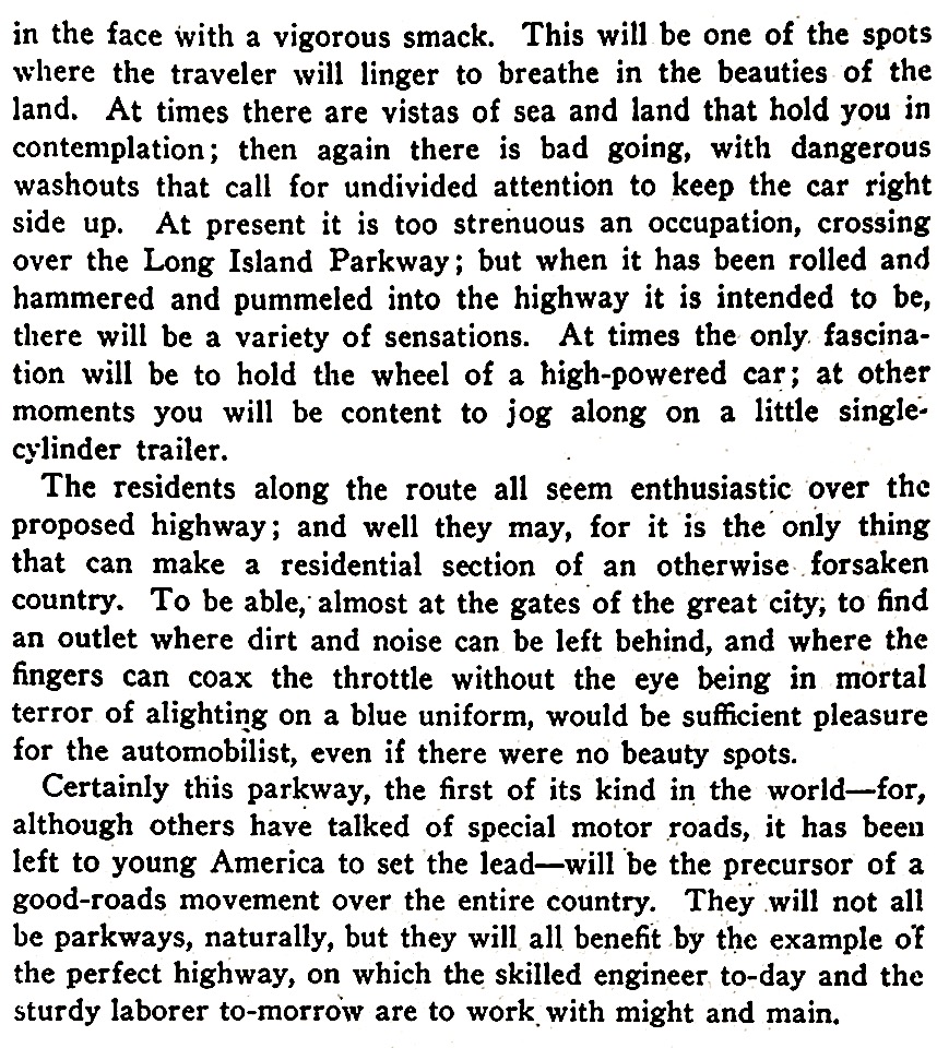 "At present it is too strenuous of an occupation, crossing of the Long Island Parkway . . . where the fingers can coax the throttle without the eye being in mortal terror of alighting on a blue uniform . . ."