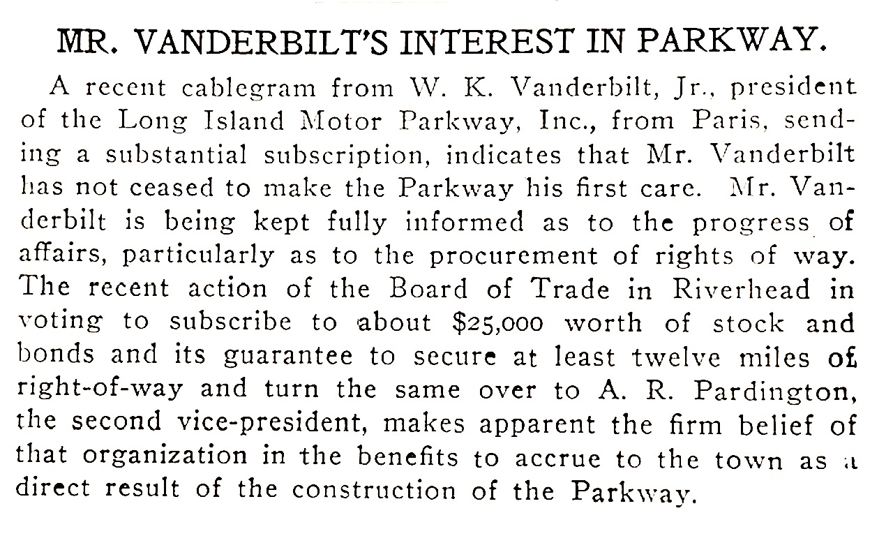 The parkway's route identified: Garden City on the west, following the course of the 1904 Vanderbilt Cup Race, Hicksville, Farmingdale . . .