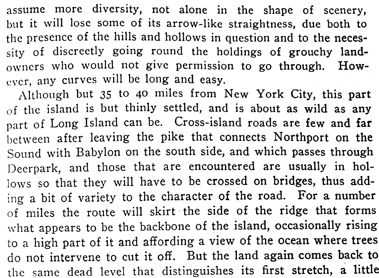 " . . . discretely going round the holdings of grouchy landowners . . .". The diversity of the island's geography, " . . . about as wild as any part of Long Island can be."