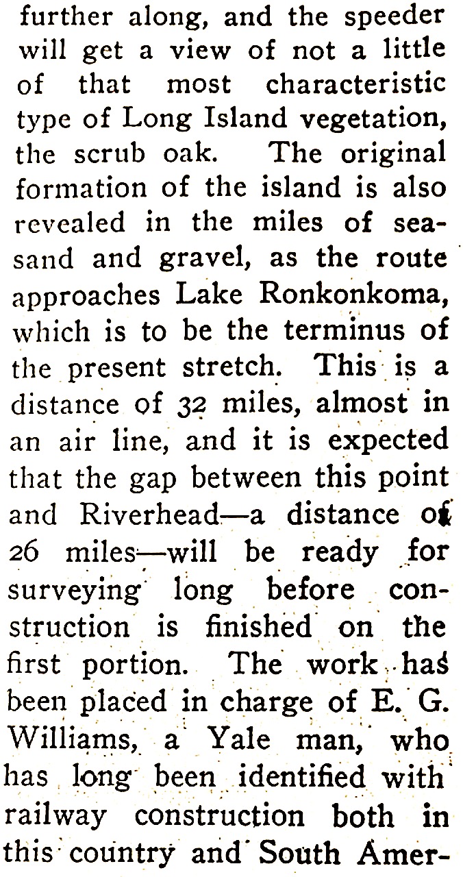The scrub oak, "miles of sand and gravel, as the route approaches Lake Ronkonkoman." Additional surveying to reach Riverhead.