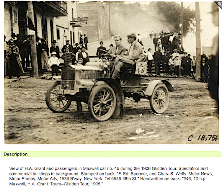 Apart from automobile articles Grant also authored the book "The Making of an Automobilist" in 1906. And apparently he participated in the 1906 Glidden Tour as shown here driving a 10 hp Maxwell. (Detroit Public Library)
