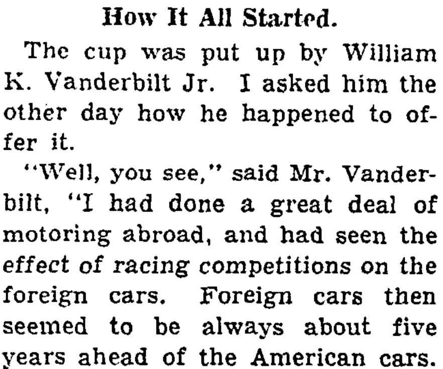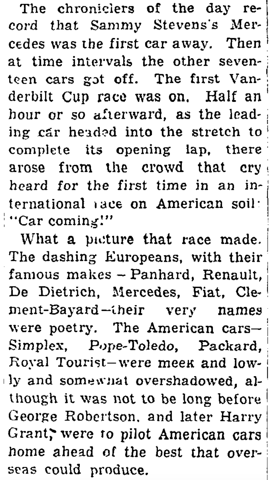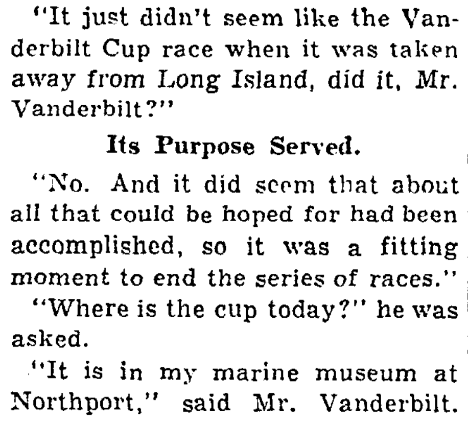 Reporter C.E.T. Scharps: "It just didn't seen like the Vanderbilt Cup Race when it was taken away from Long Island, did it Mr. Vanderbilt?"