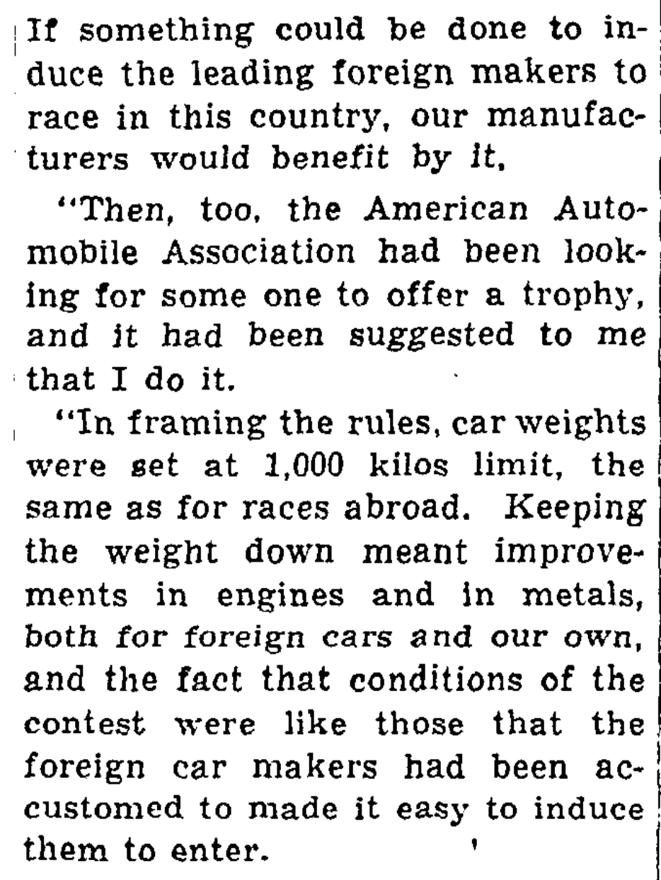 Willie K.: "If something could be done to induce the leading foreign makers to race in this country, our manufacturers would benefit by it."