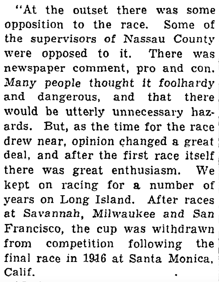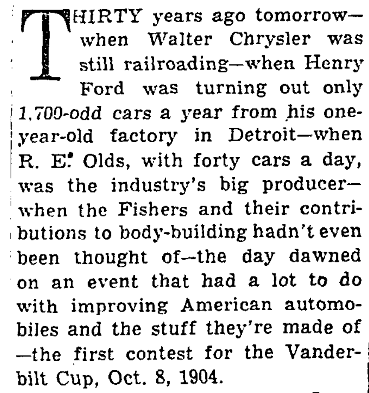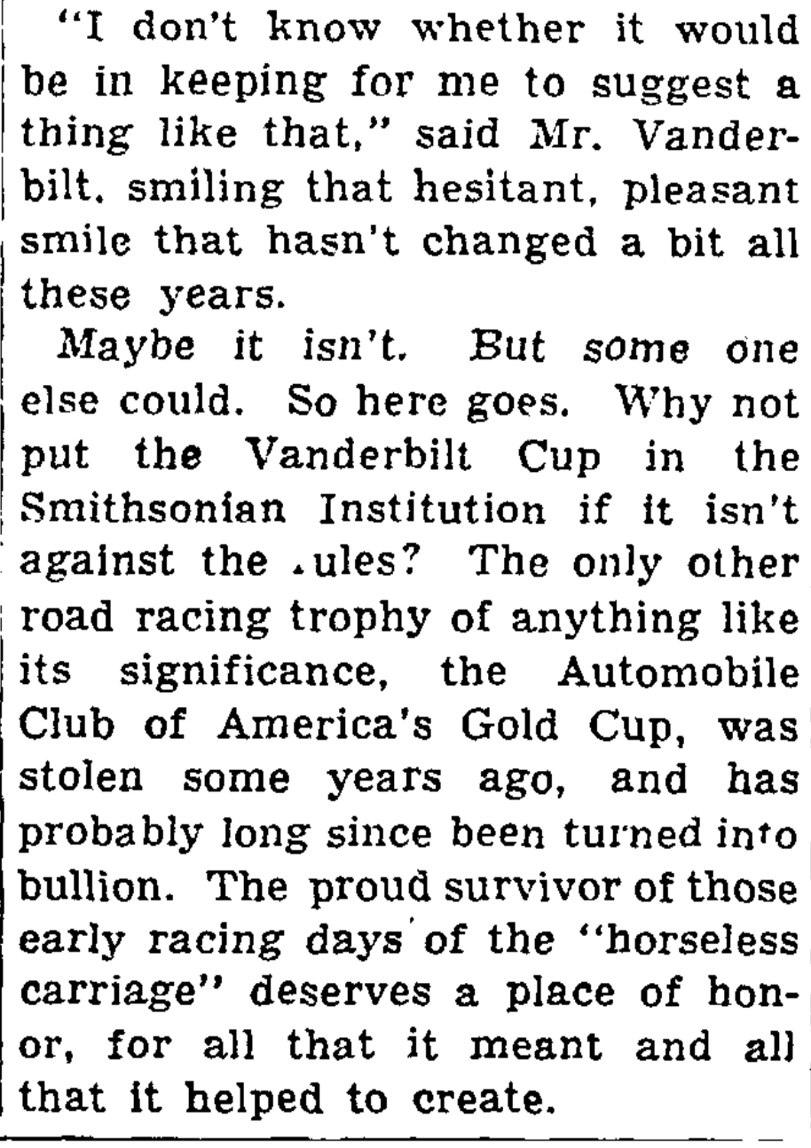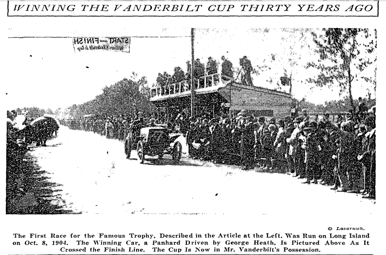A retrospective interview with Willie K. concerning the first Vanderbilt Cup Race was conducted by a New York Times reporter and published on October 7, 1934, 30 years following the running of the race. It is the only known interview that Willie K. gave concerning the Vanderbilt Cup Races.
