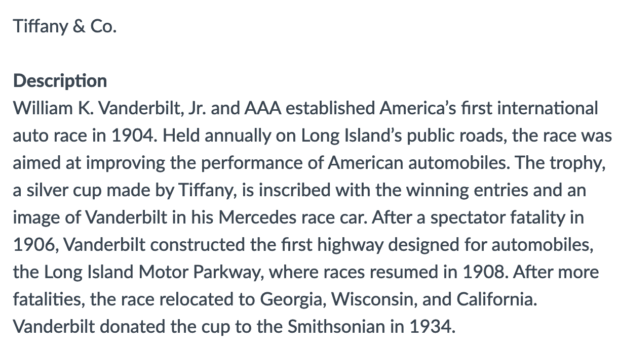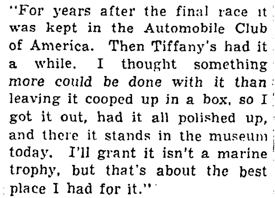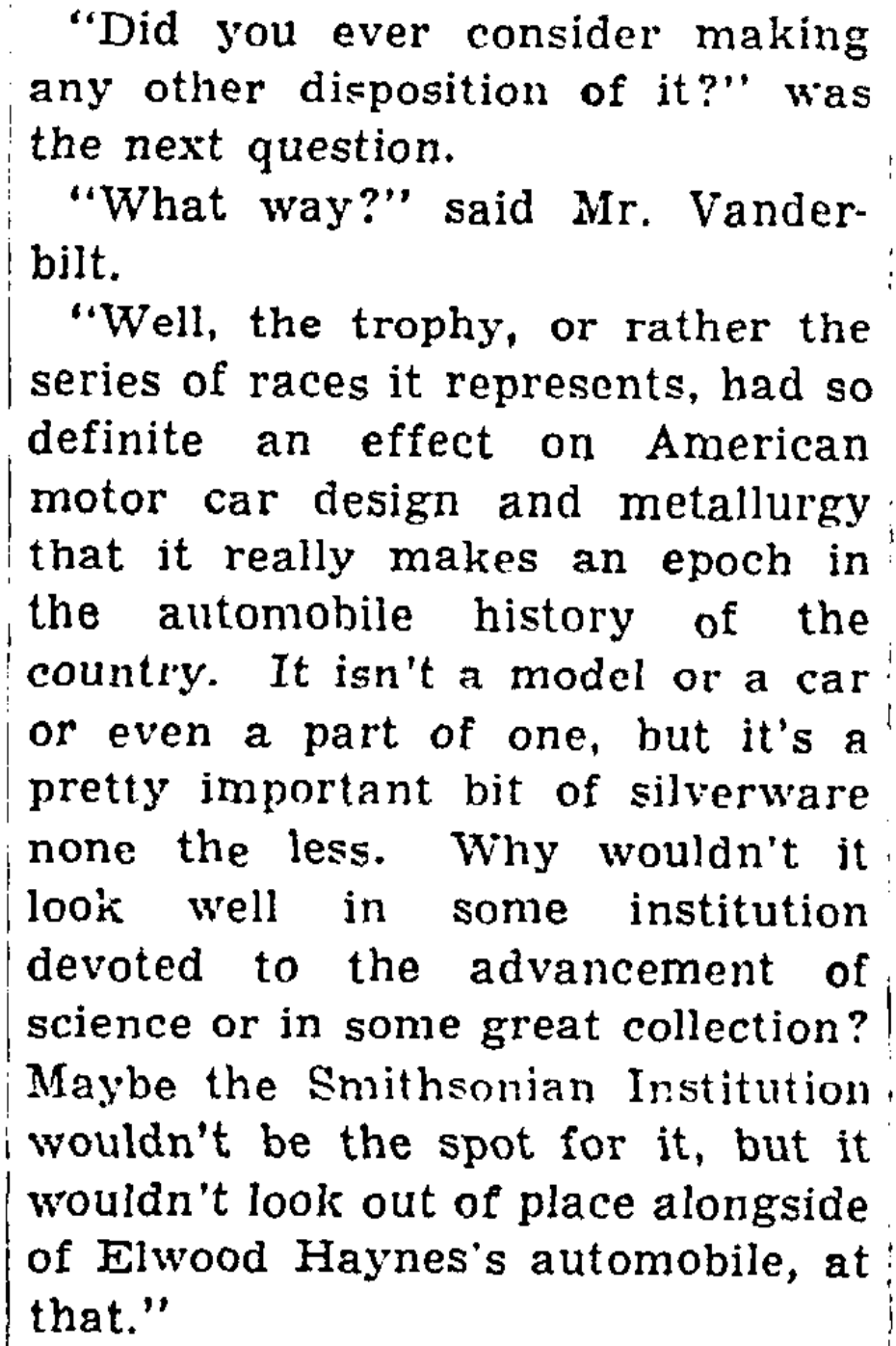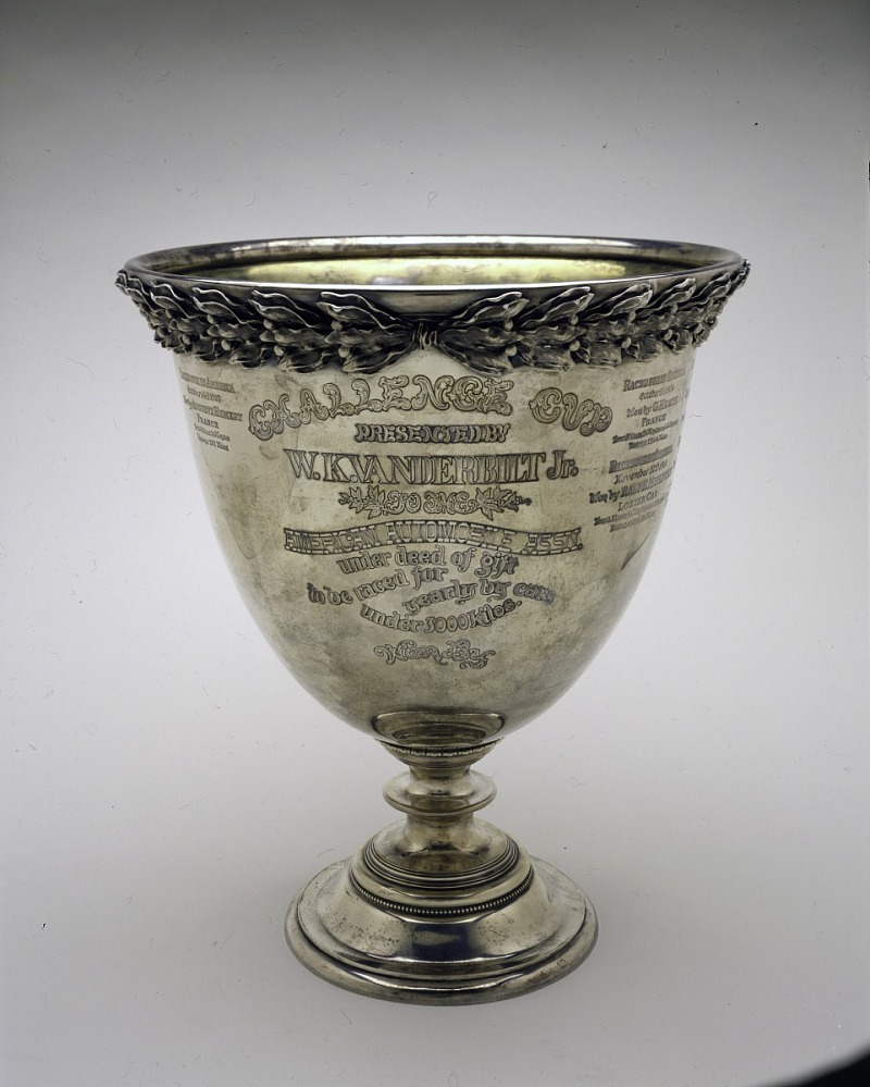 The Vanderbilt Cup Trophy has been taken out of storage and is currently on display at the “Nation of Speed” exhibit at the National Air and Space Museum in Washington, D.C.