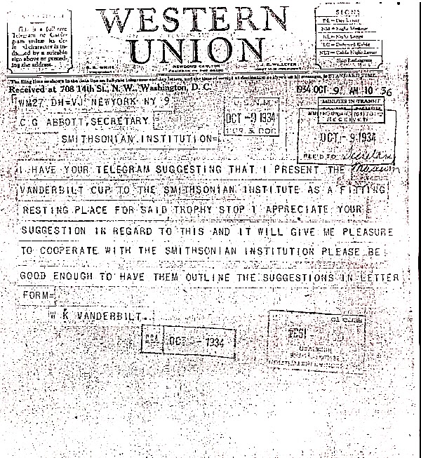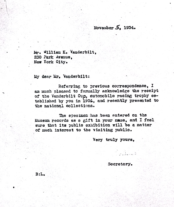 Willie K. donated the cup to the Smithsonian in 1934 after being asked by C.G. Abbott, Secretary of the Smithsonian Institution. This is Willie's initial response.