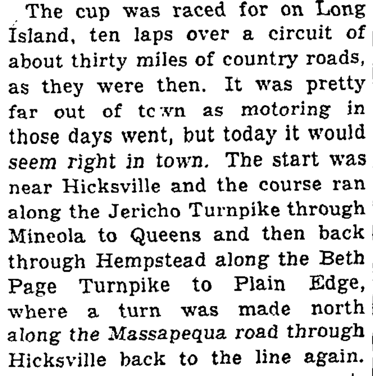 Hi Dennis, the 1904 Vanderbilt Cup Race was the only race that ran clockwise from Queens to Jericho/Hicksville