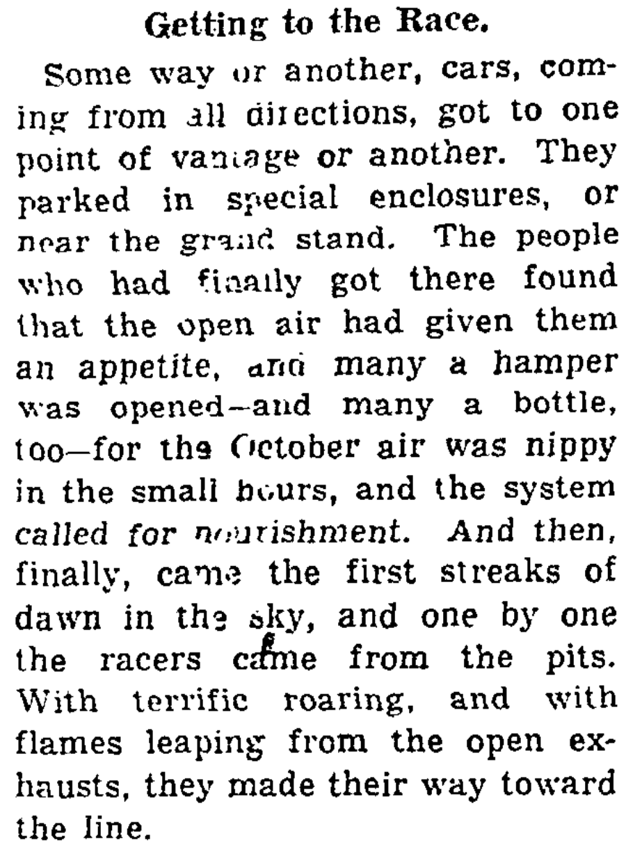 The first part of the article is a narrative by the reporter, C.E.T. Sharpes, about the origin of the race, the course, getting to the race and the cars themselves. Following this are the answers that Willie gave to the questions asked by Sharpes.